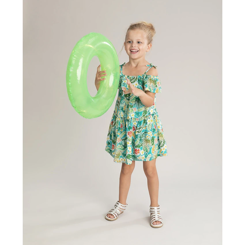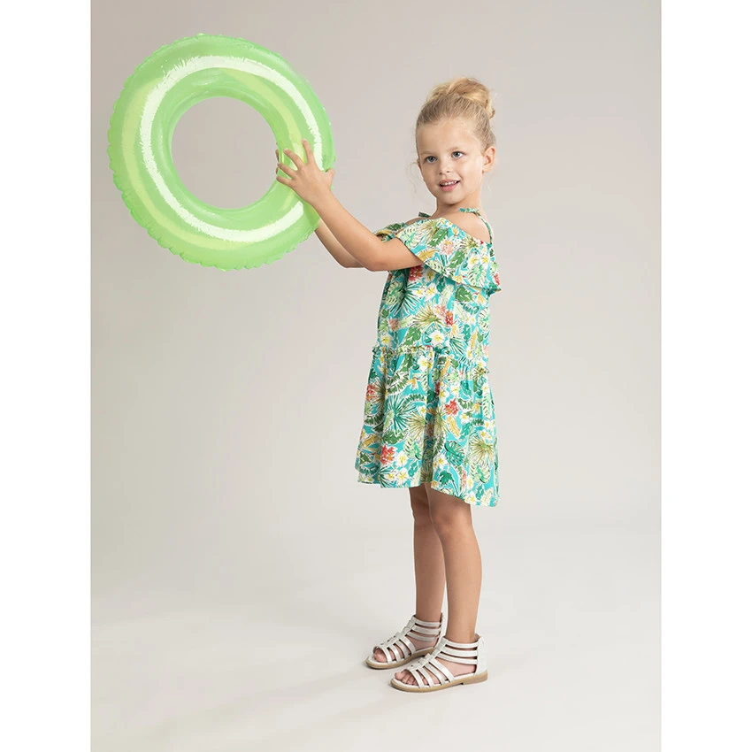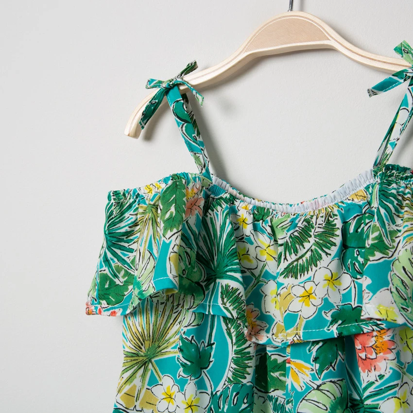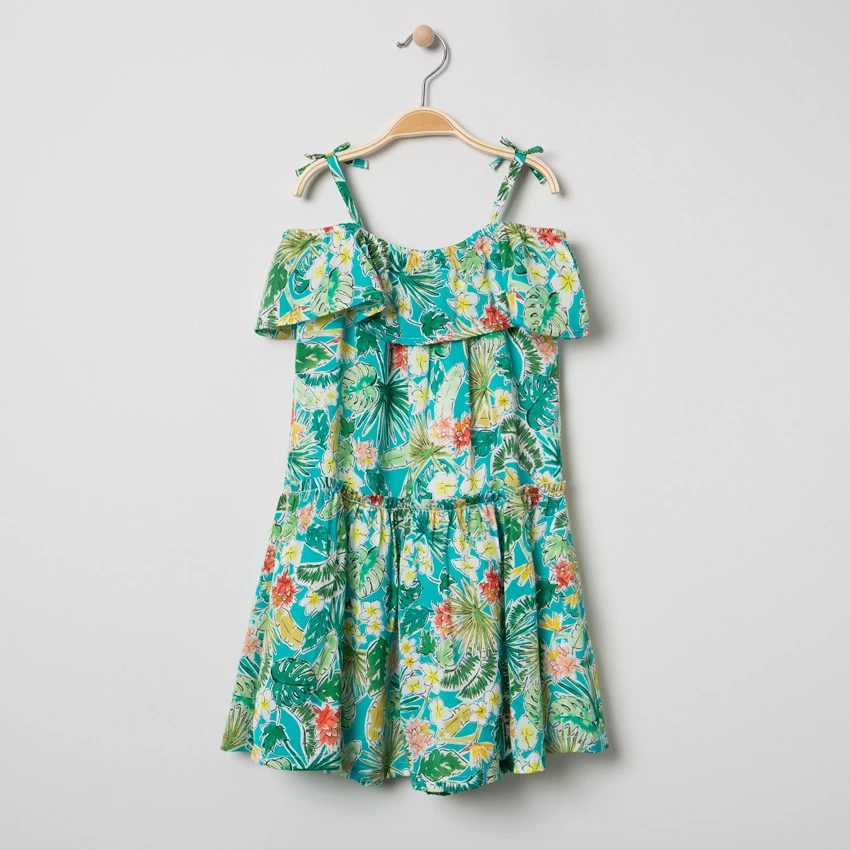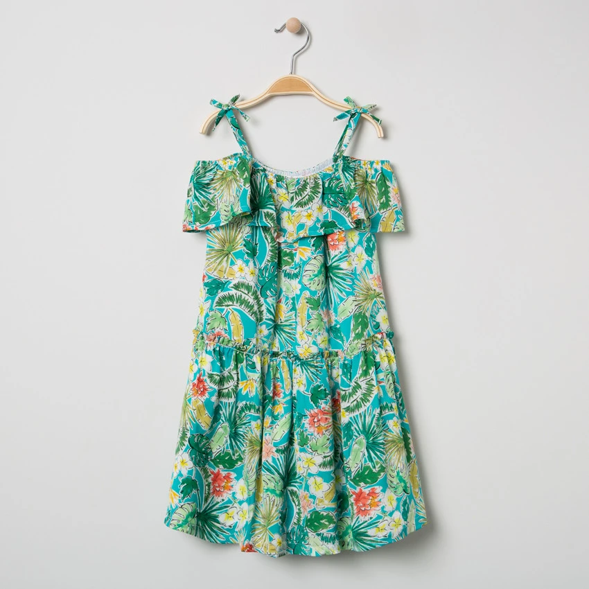 Robe à épaules dénudées. Bretelles à nouettes. Volant sur la poitrine. Découpe à la taille. Doublure intégrée.
