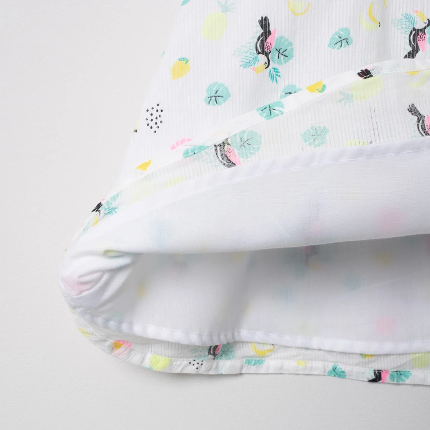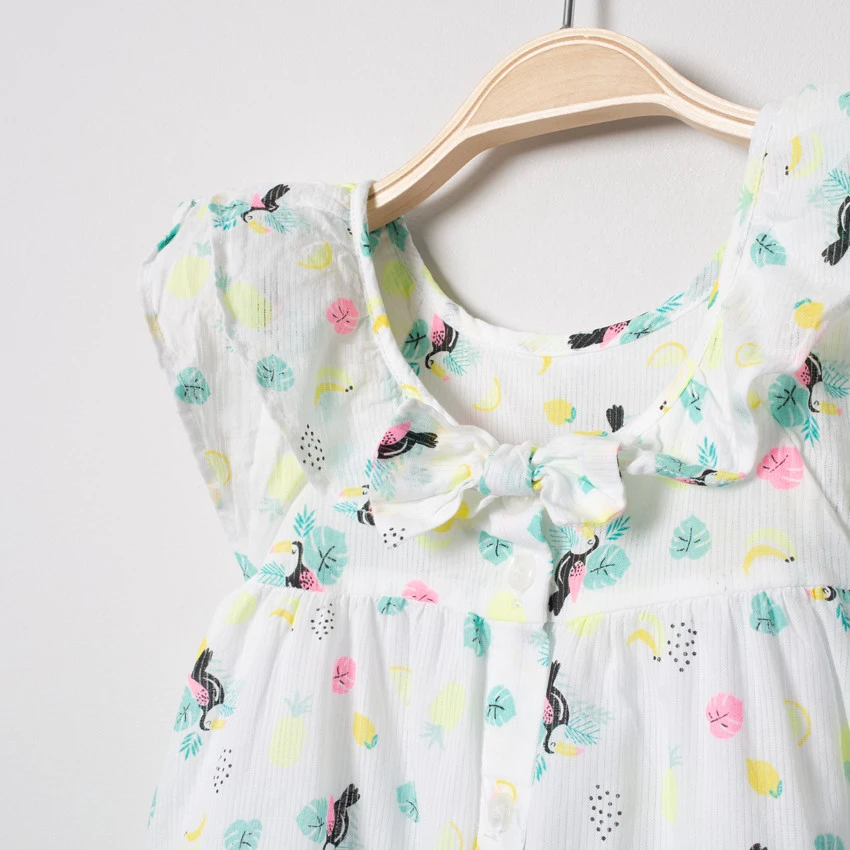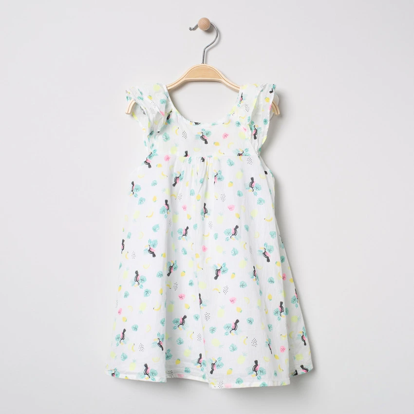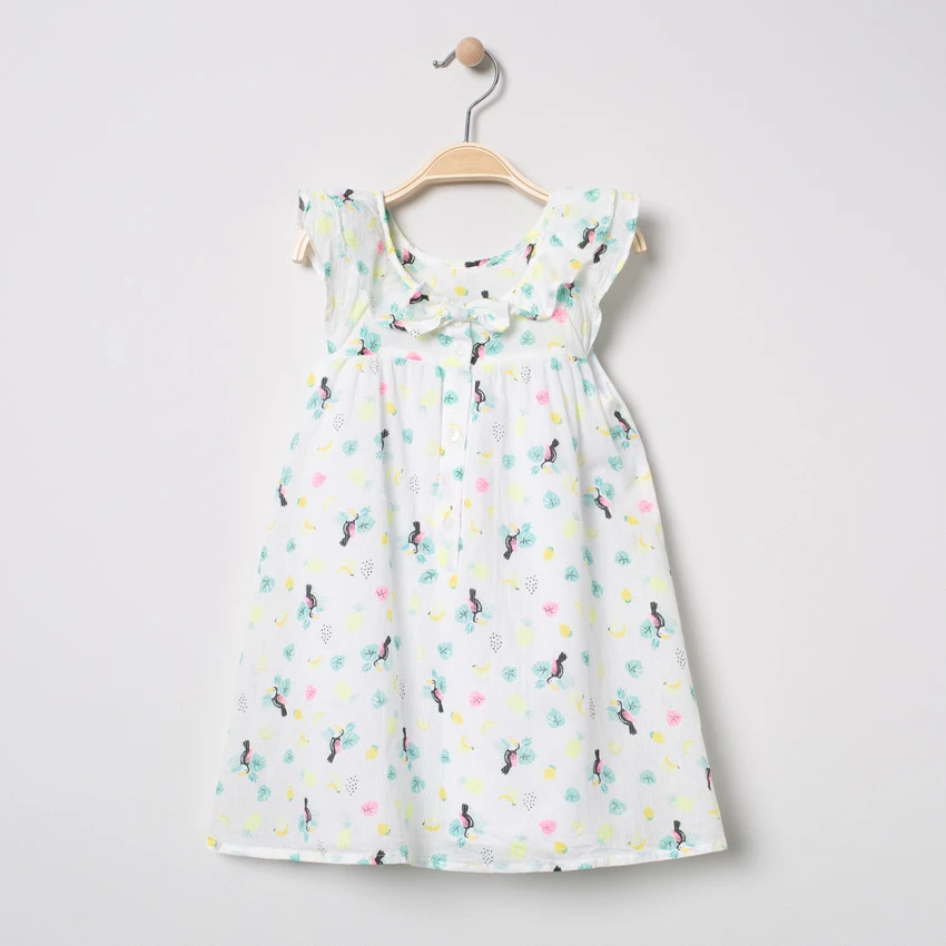 Robe à manches volantées imprimée all-over. Encolure ronde. Découpe sous poitrine. Ouverture boutonnée au dos. Doublure intégrée.
