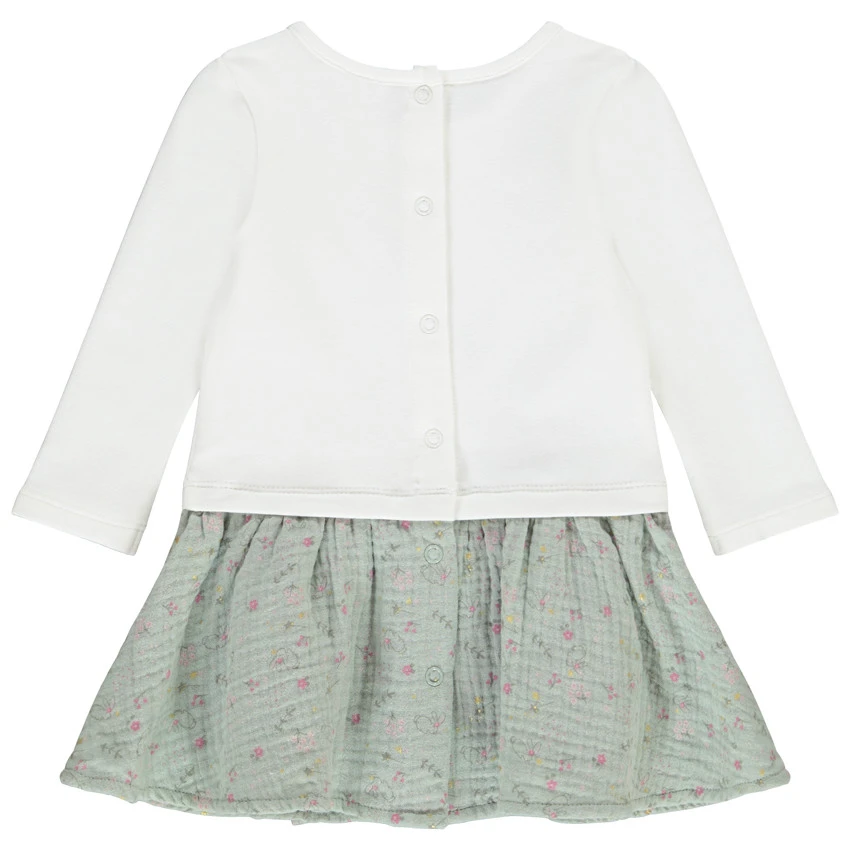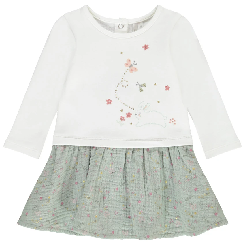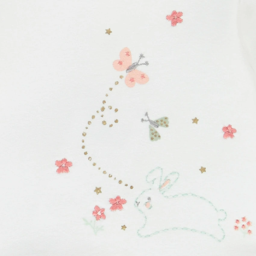 Haut style t-shirt à manches longues. Encolure ronde. Broderies et prints papillon, fleurs et lapin sur le devant. Ouverture pressionnée à l’arrière. Jupe en double gaze de coton. Effet plissé. Print fleurs all-over. Doublure unie.