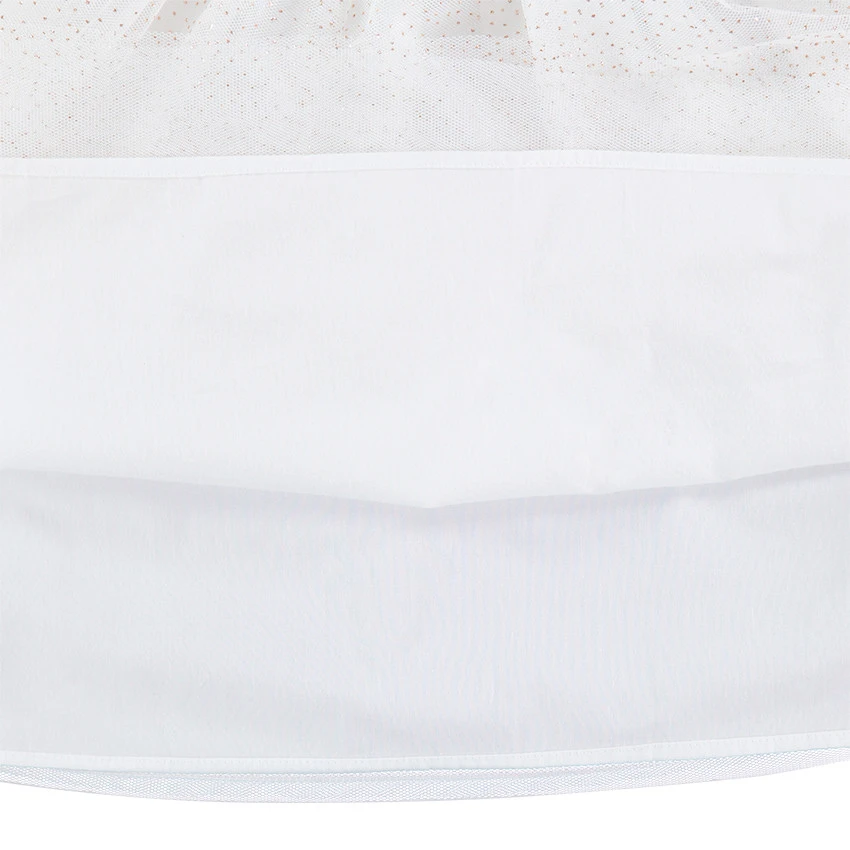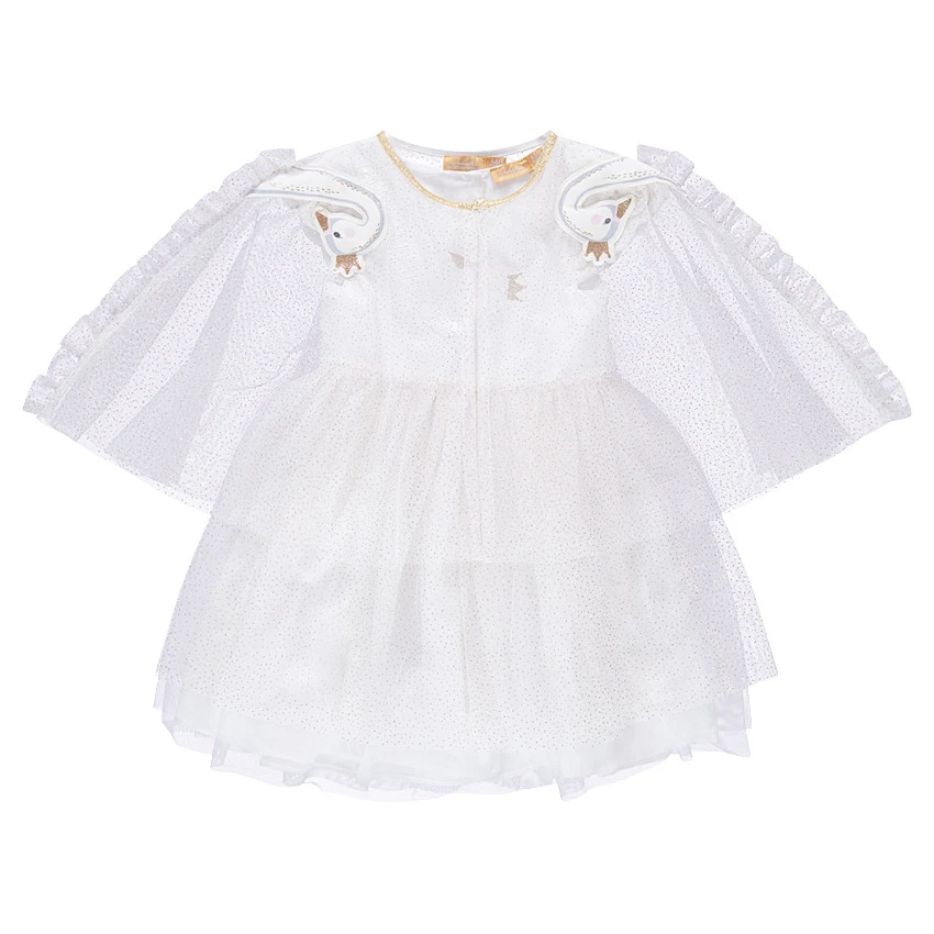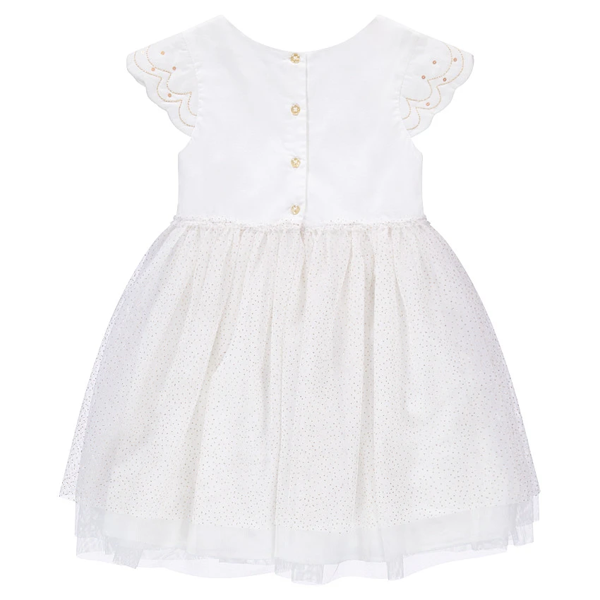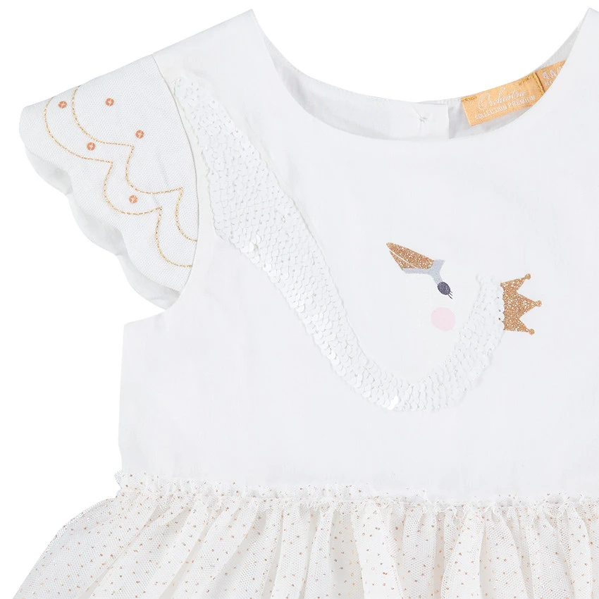 Robe de fêtes manches courtes bi-matière. Encolure ronde. Cygne en sequins sur le devant. Fines broderies sur les manches. Bas de la robe en tulle volanté avec pois dorés. Doublure intégrée. Ouverture boutonnée au dos.