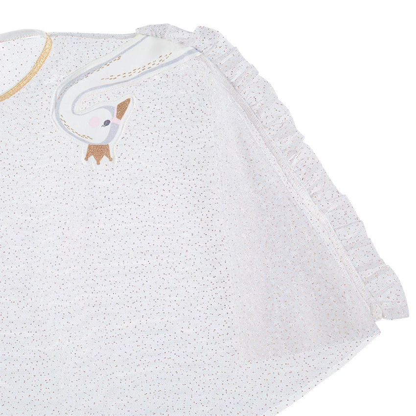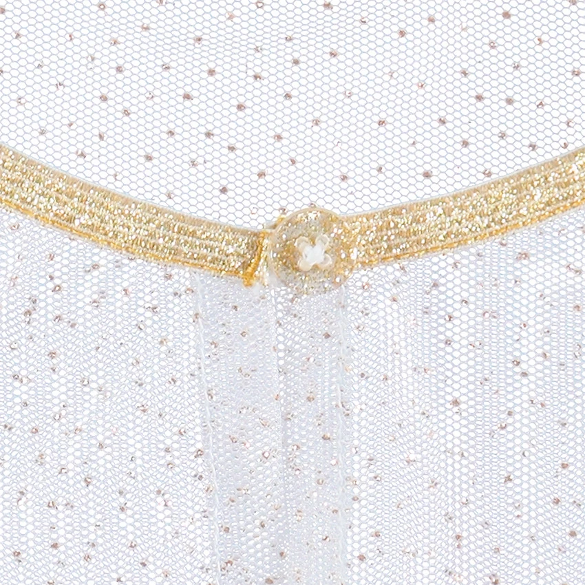 Cape en tulle avec pois dorés. Volants et cygnes sur les côtés. Encolure ronde dorée. Ouverture par 1 bouton sur le col.