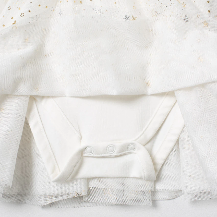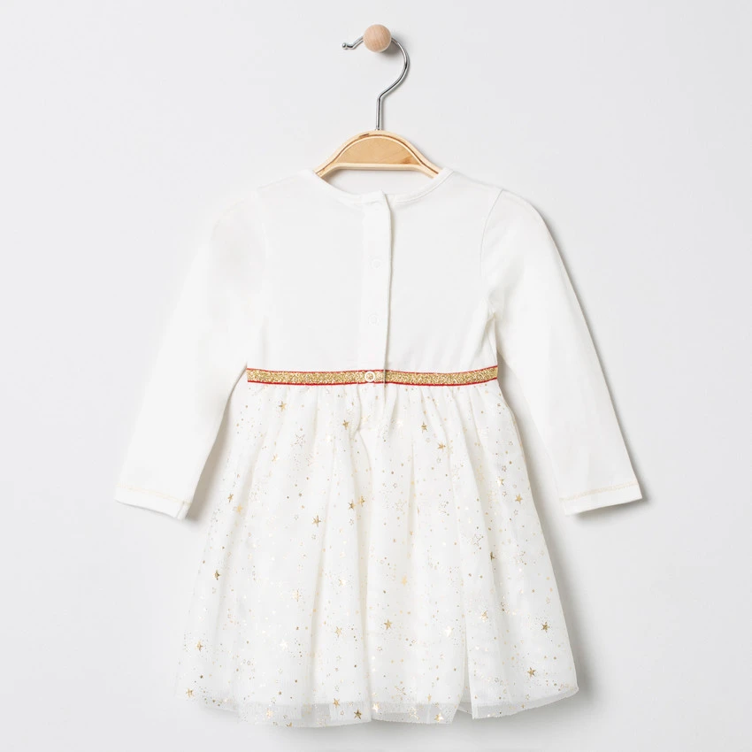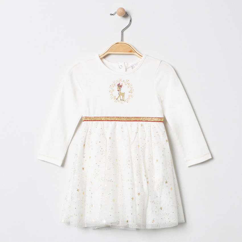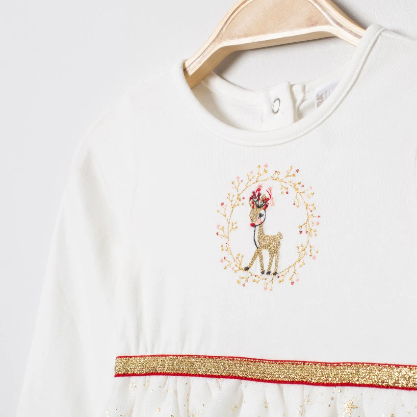 Robe manches longues effet 2 en 1. Encolure ronde en bord-côte. Renne brodé sur la poitrine. Biais doré à la taille. Tulle à étoiles dorées doublé. Ouverture pressionnée au dos. Entrejambe pressionné façon body.