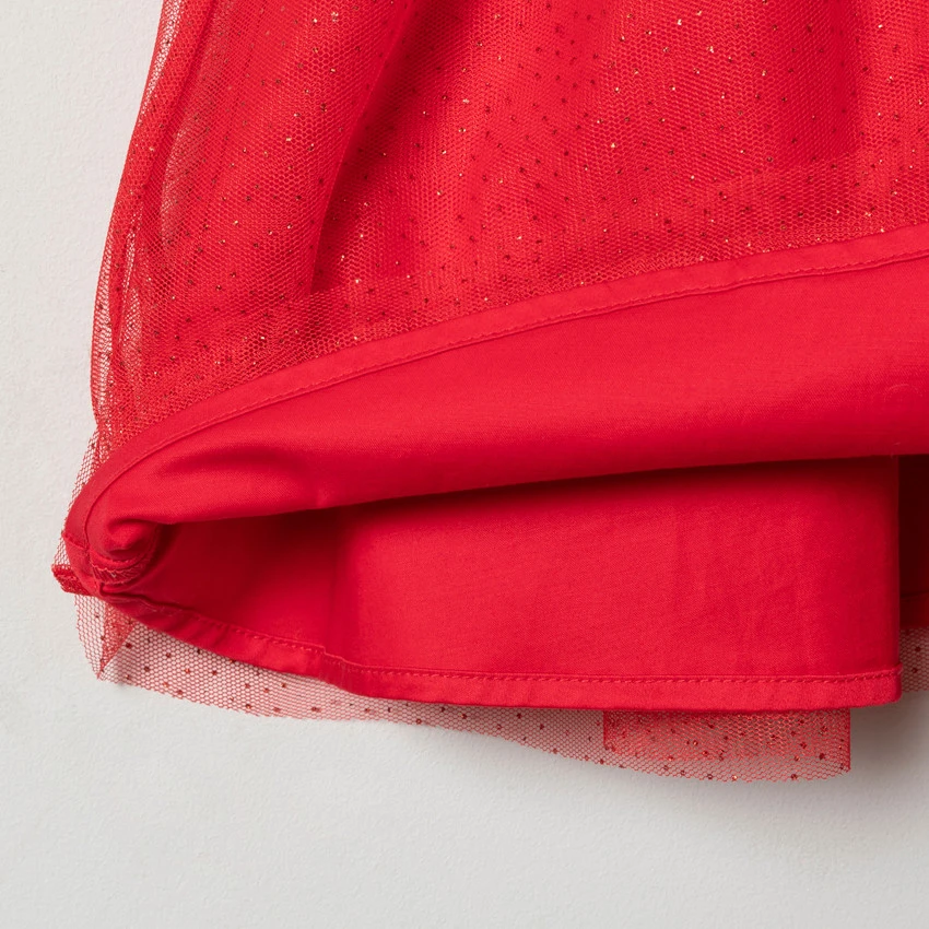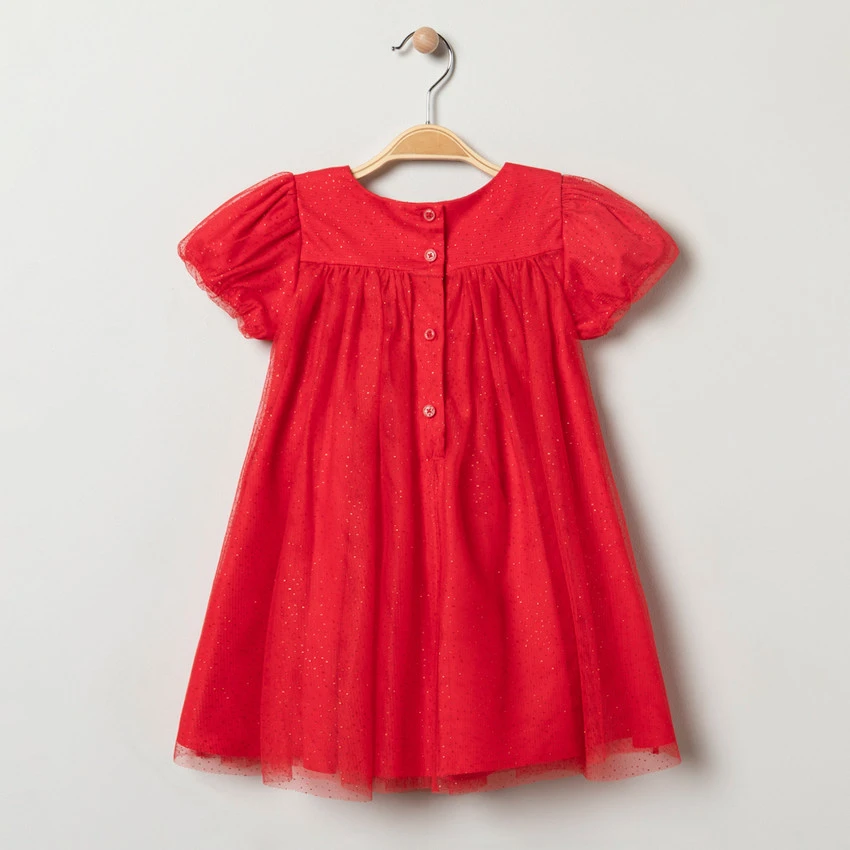 Robe de fêtes manches courtes rouge. Col rond. Noeud en velours sur la poitrine. Doublure intégrée pour plus de confort. Ouverture boutonnée au dos.