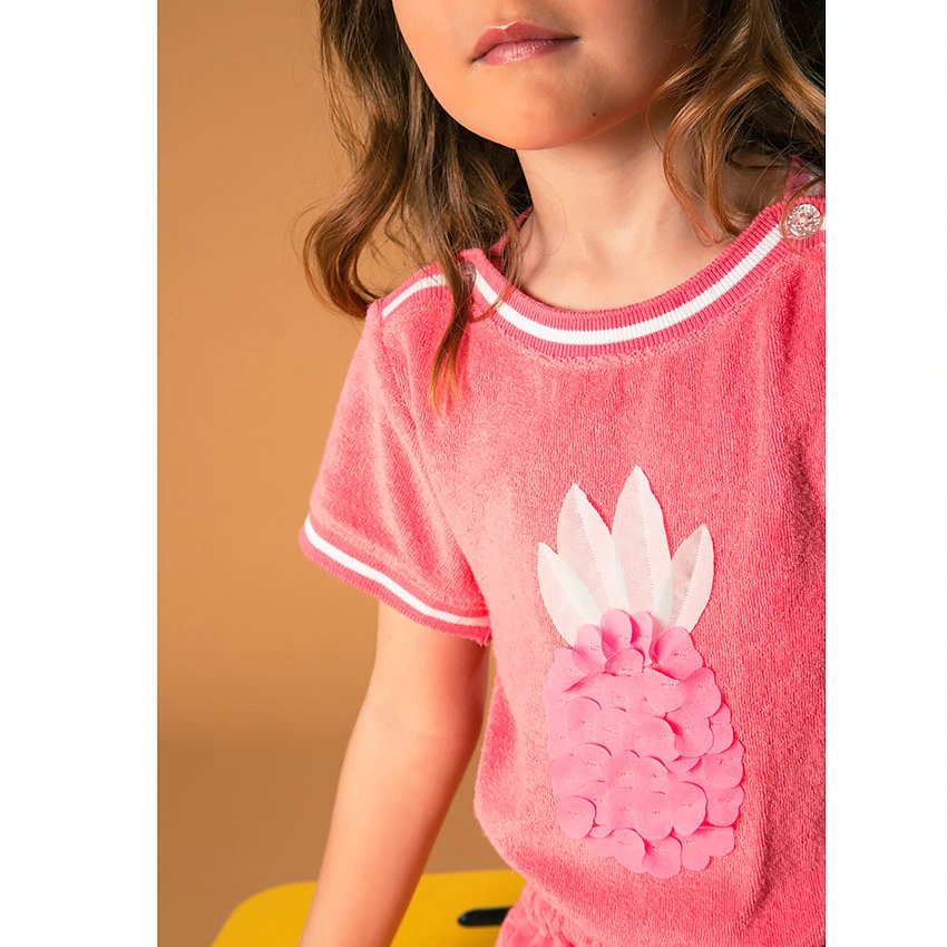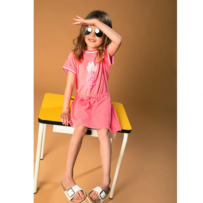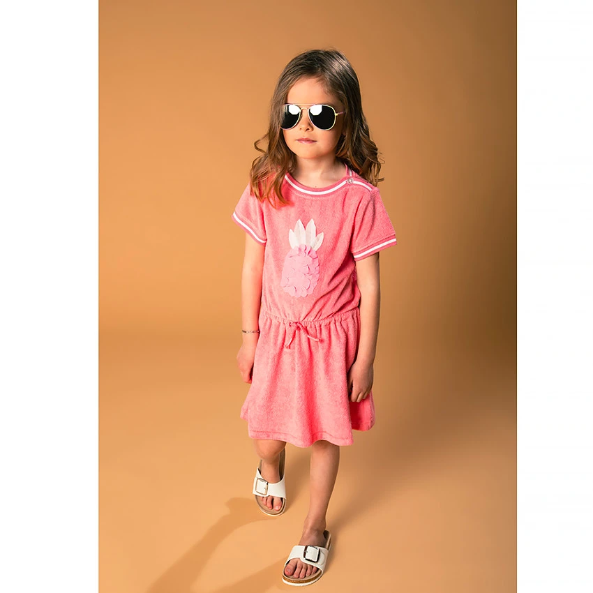 Robe de plage en éponge. Manches courtes. Col rond avec ouverture boutonnée. Ananas cousu sur le devant. Taille marquée par un cordon.