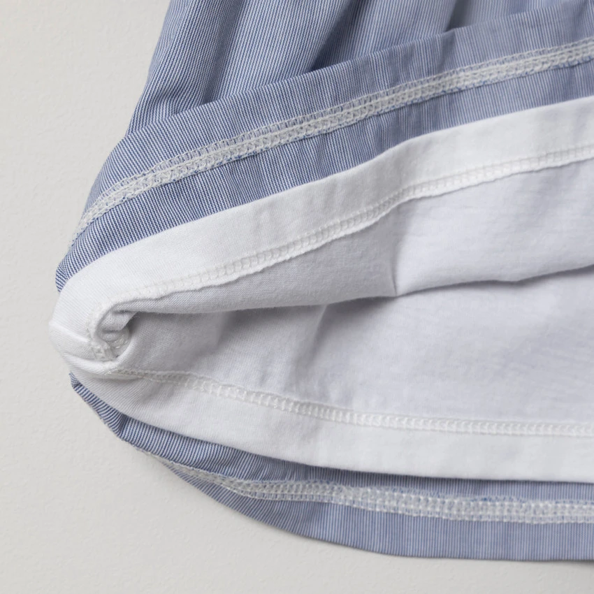 Robe manches longues effet 2 en 1. Encolure ronde en bord-côte. Lapin brodé sur le devant. Ouverture goutte au dos. Bas de la robe en chambray avec micro rayures. Doublure intégrée.