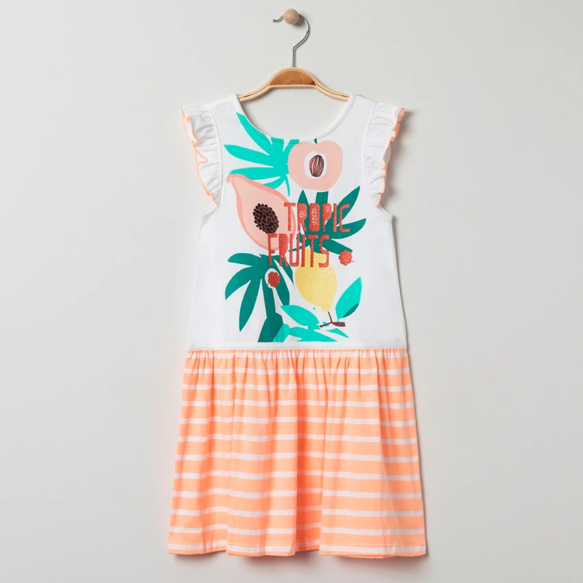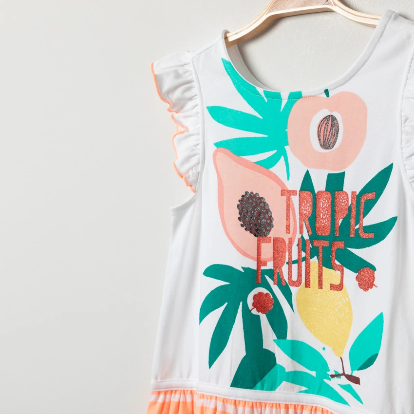 Robe en coton issu de l’agriculture biologique à manches volantées. Fruits imprimés et texte pailleté sur le devant. Encolure ronde. Bas de la robe rayé.