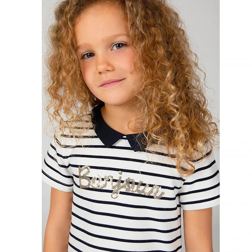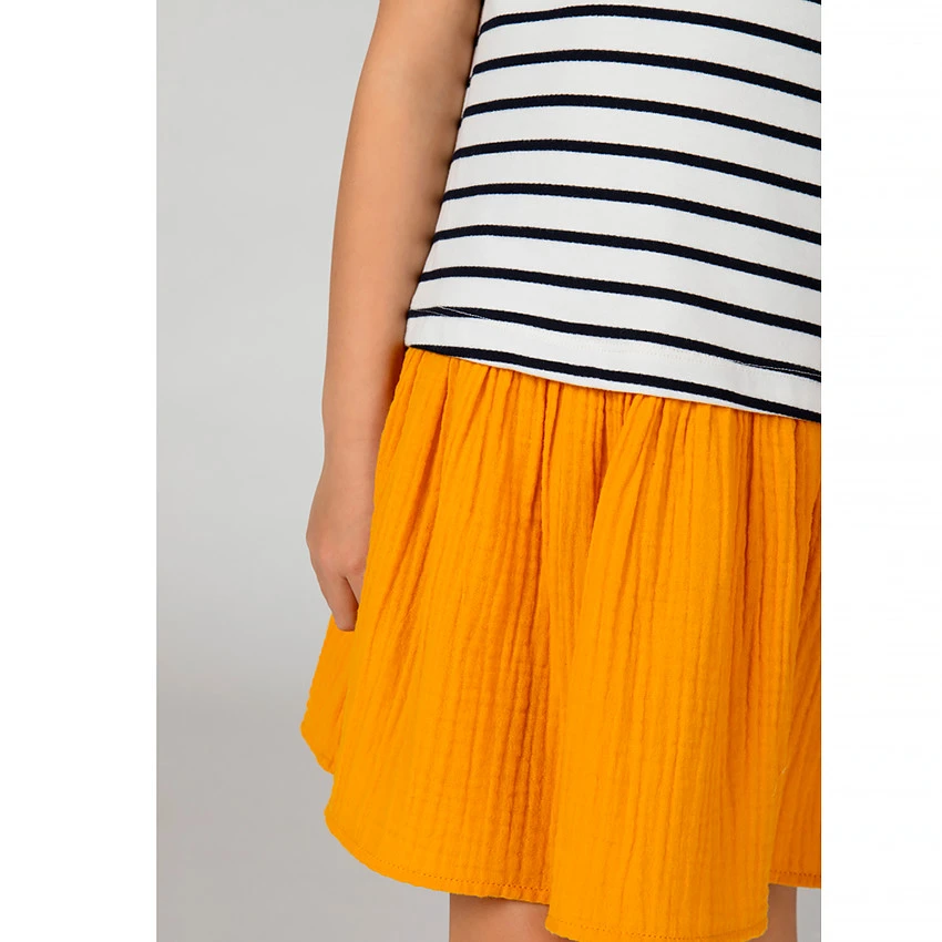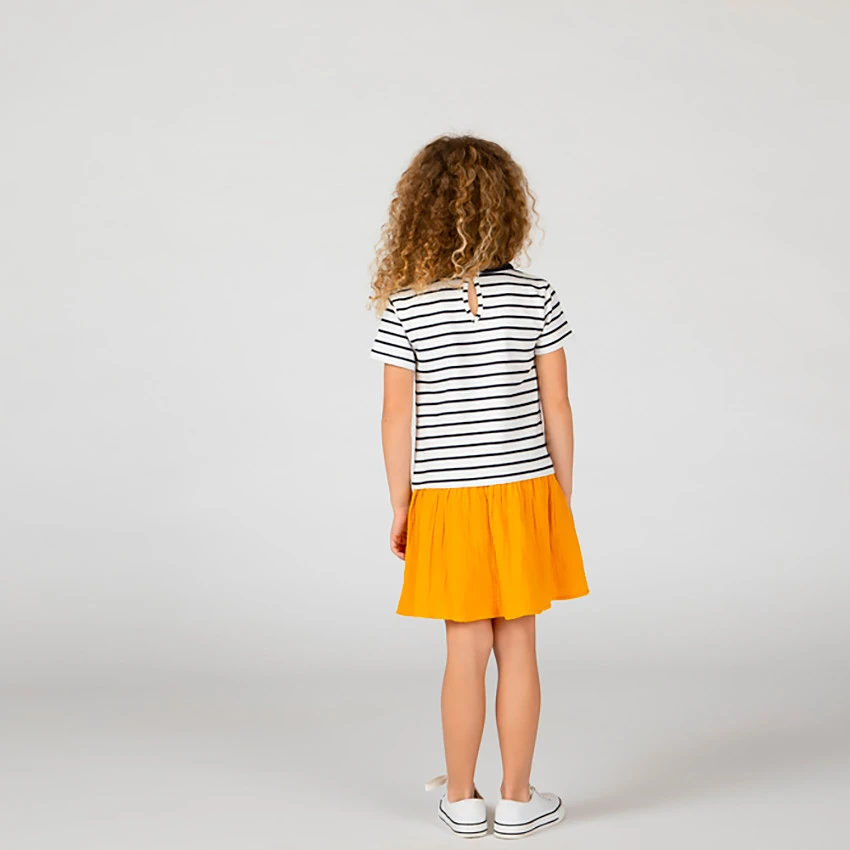 Robe en maille manches courtes. Col claudine. Rayures sur le haut de la robe. Bouton à l’arrière du col. Bas de la robe ample jaune.