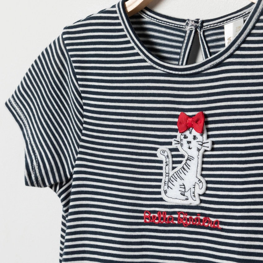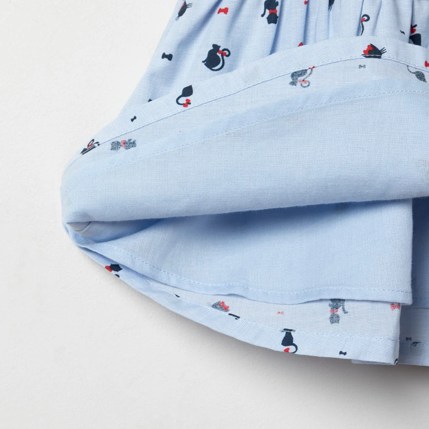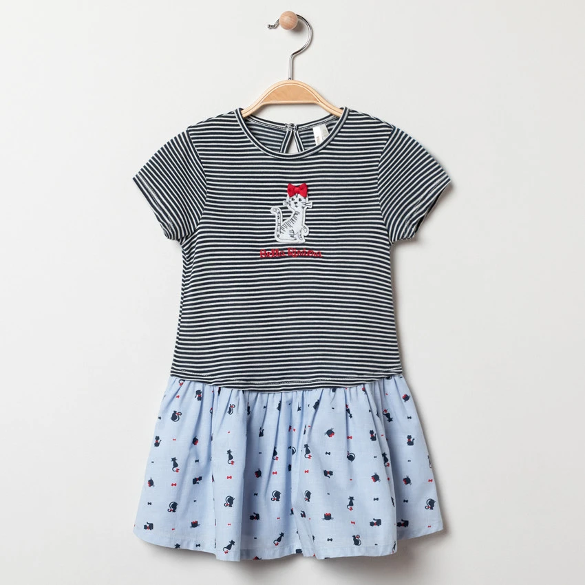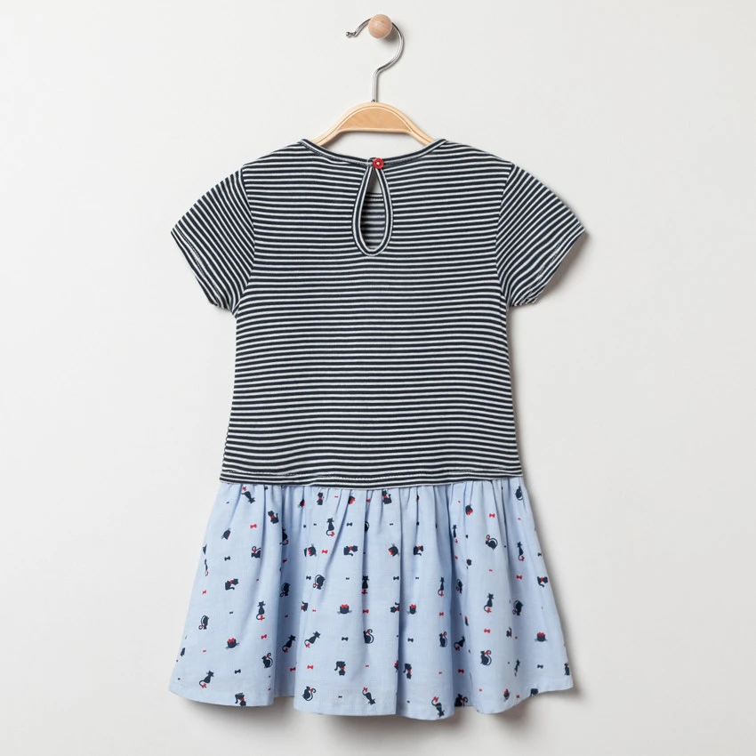 Robe manches courte. Encolure ronde. Patch chat cousu sur le devant. Bas avec print chat all-over. Ouverture boutonnée au dos.
