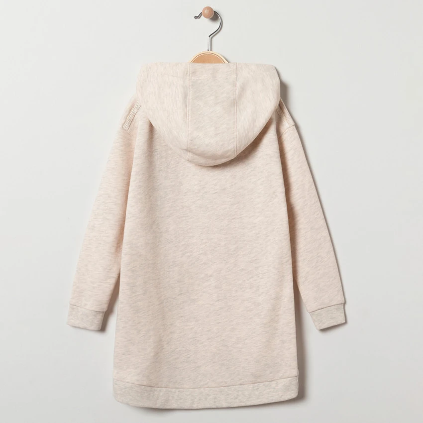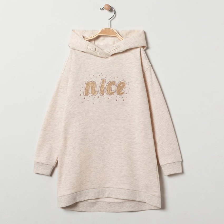 Robe manches longues à capuche. Cordon de serrage à la capuche. Message en strass sur le devant. Poignets et bas en bord-côte élastiqués.