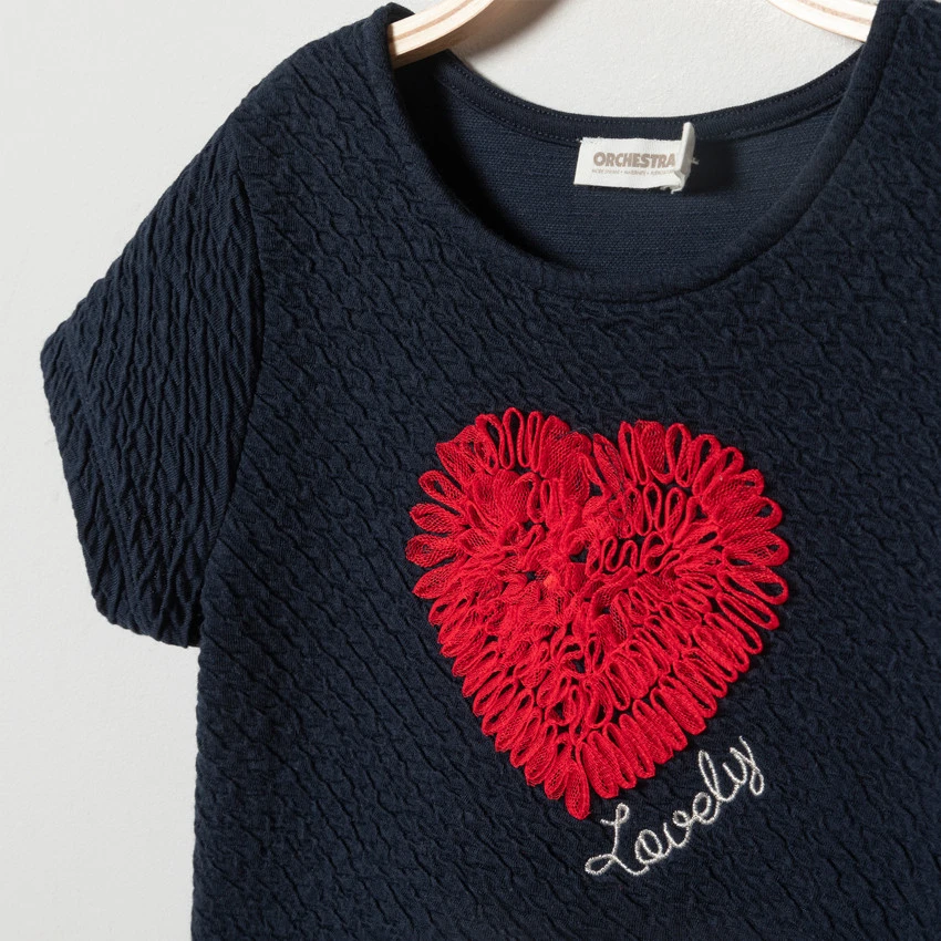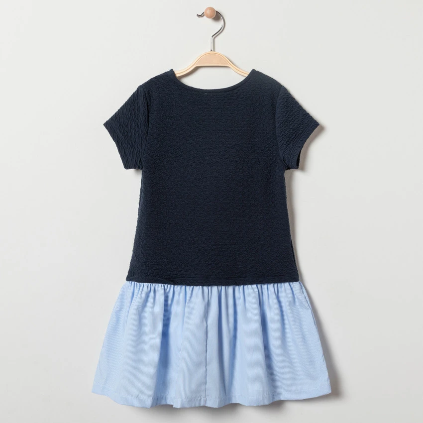 Robe en molleton 2 en 1. Haut t-shirt manches courtes. Encolure ronde. Ruché et print sur le devant. Jupe effet chemise, plissée à la taille.