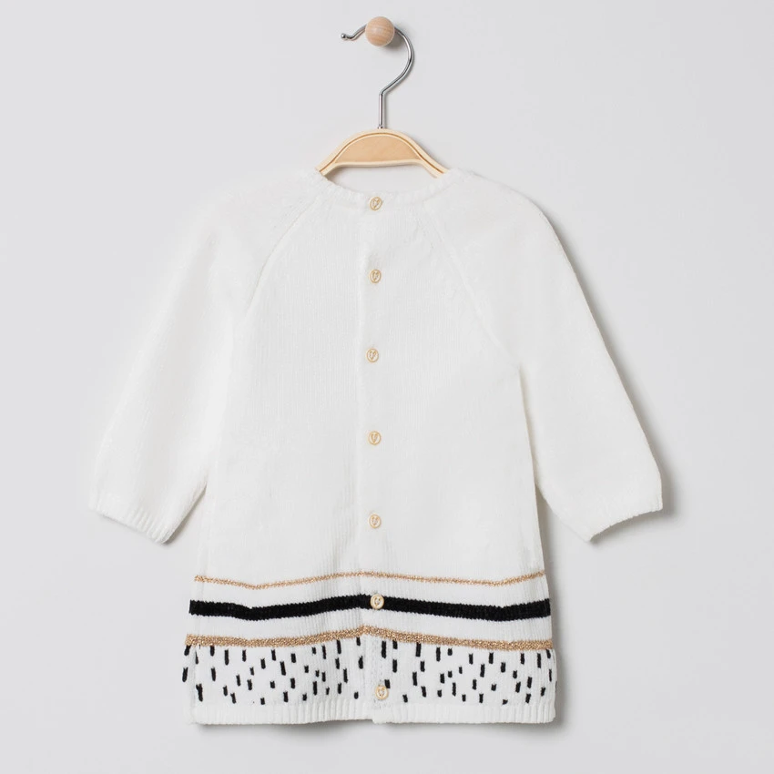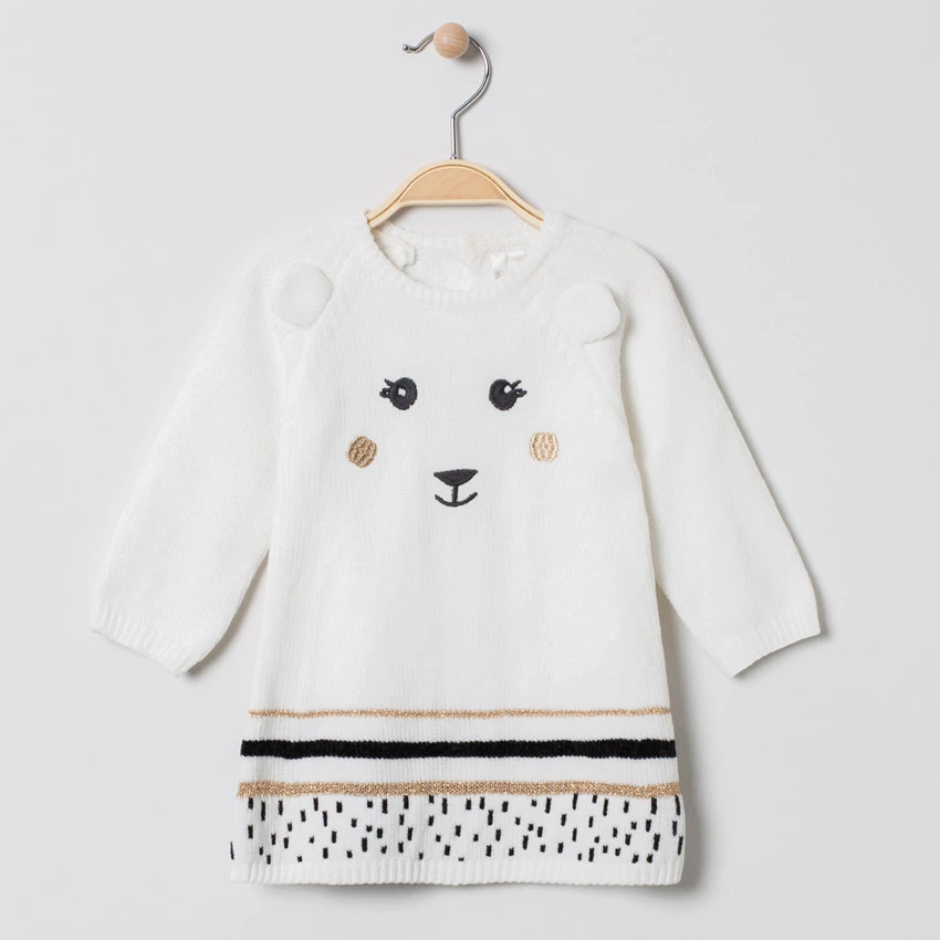 Robe manches longues en tricot. Encolure ronde en bord-côte. Détails brodés. Oreilles en relief. Rayures contrastées sur le bas du pull. Ouverture boutonnée au dos.