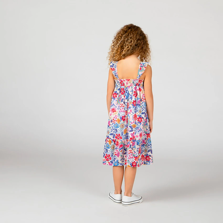 Robe longue. Bretelles fines volantées. Poitrine et dos élastiqués. Bas de la robe marqué. Imprimé fleuri all-over.