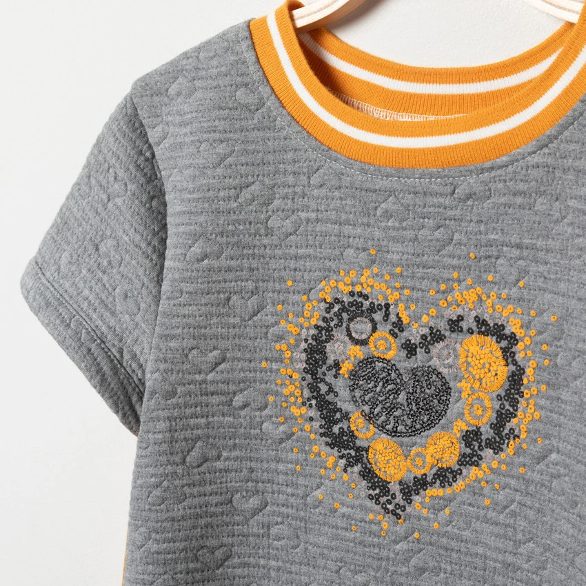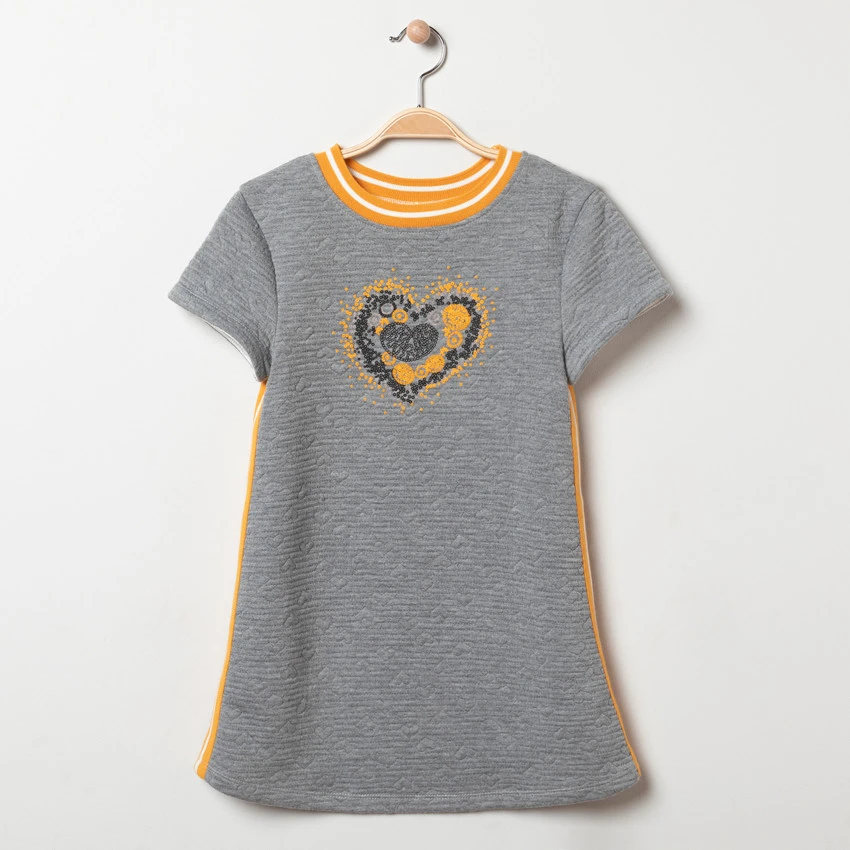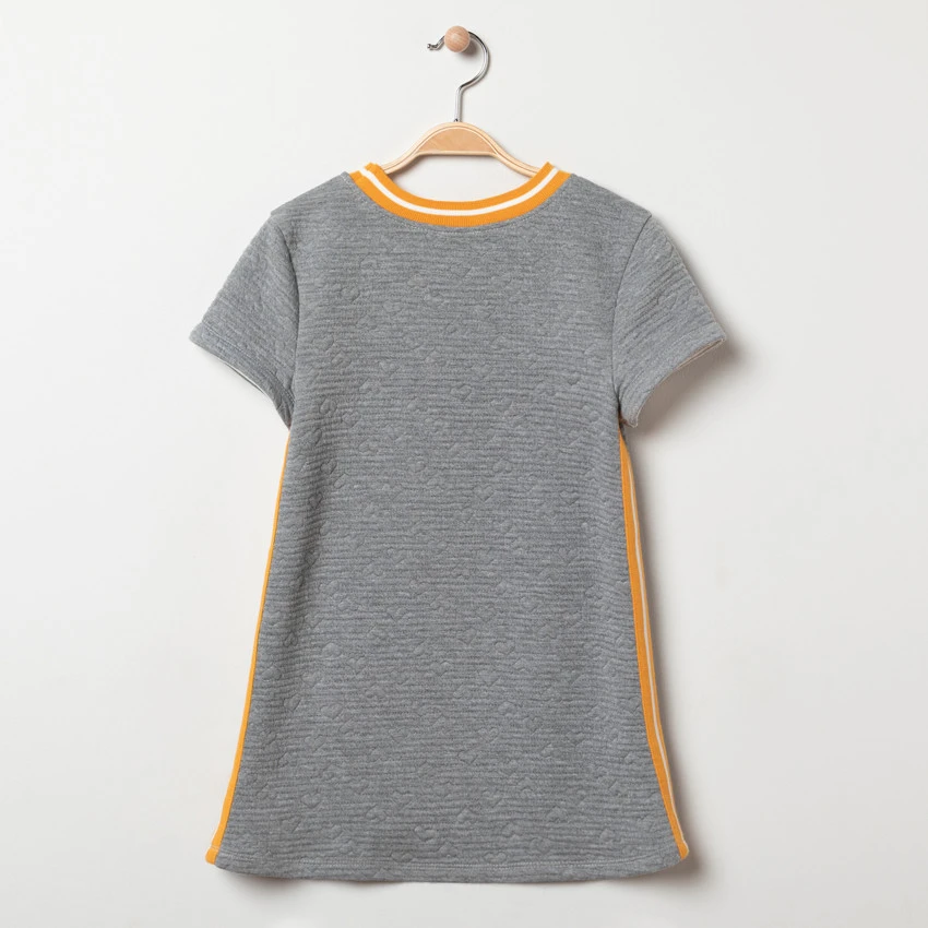 Robe manches courtes en molleton fantaisie. Col en maille extensible rayée pour faciliter le passage de la tête. Coeur printé sur le devant. Bandes sur les côtés esprit sportswear.