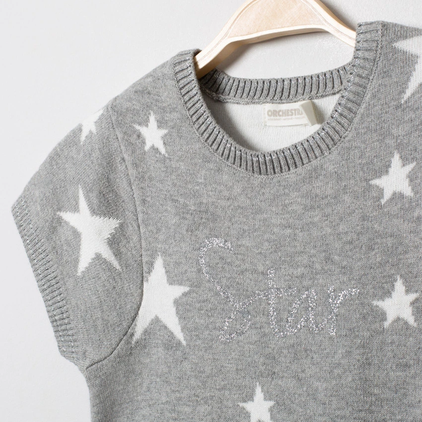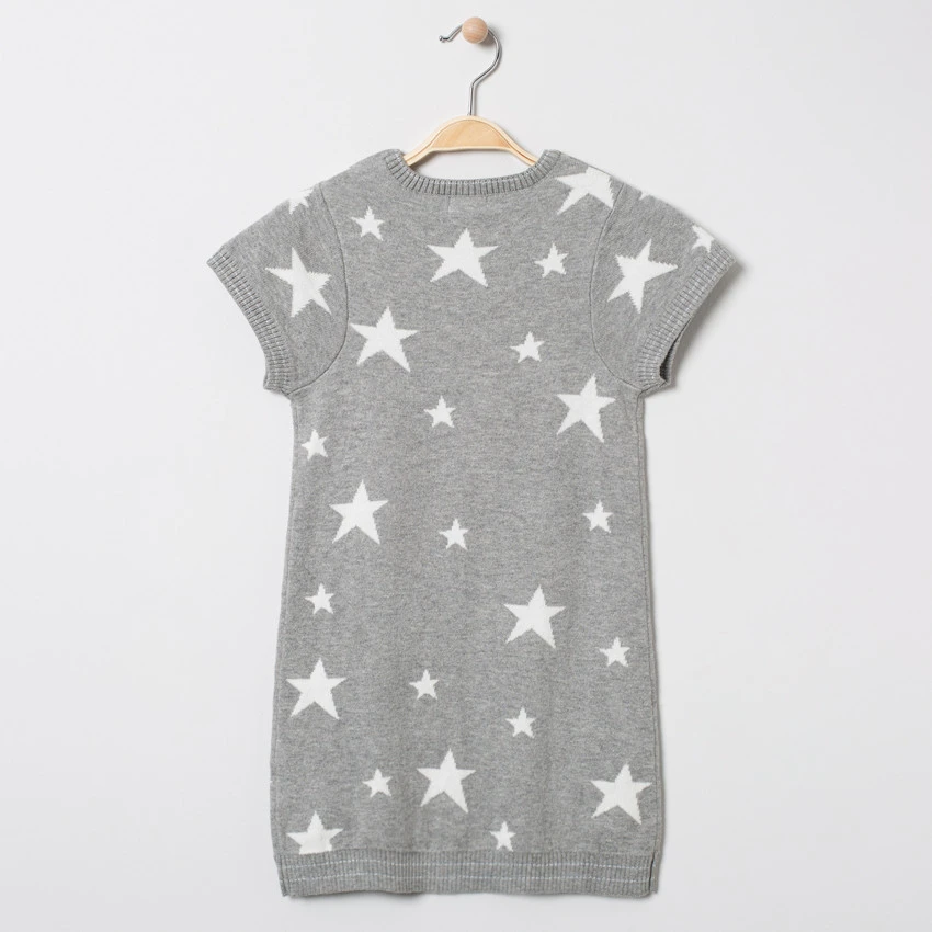 Robe manches courtes en tricot. Col rond en maille extensible. Etoiles en jacquard. Texte pailleté printé devant. Bout des manches et base en maille extensible.