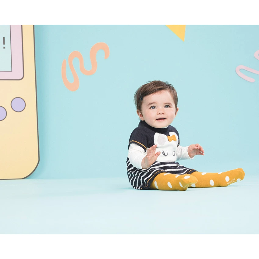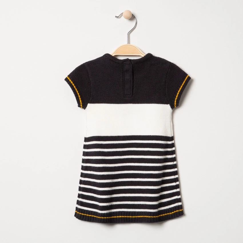 Robe en tricot manches courtes. Encolure ronde en bord-côte. Souris en jacquard avec noeud devant et rayures. Ouverture pressionnée au dos. Finitions en bord-côte.