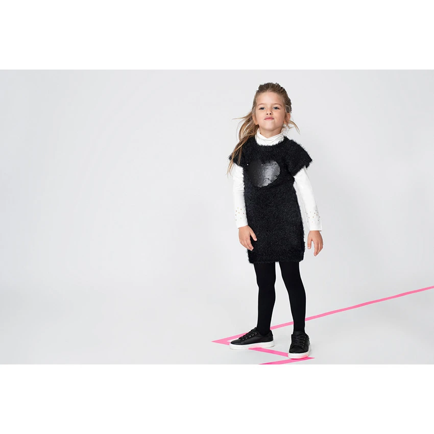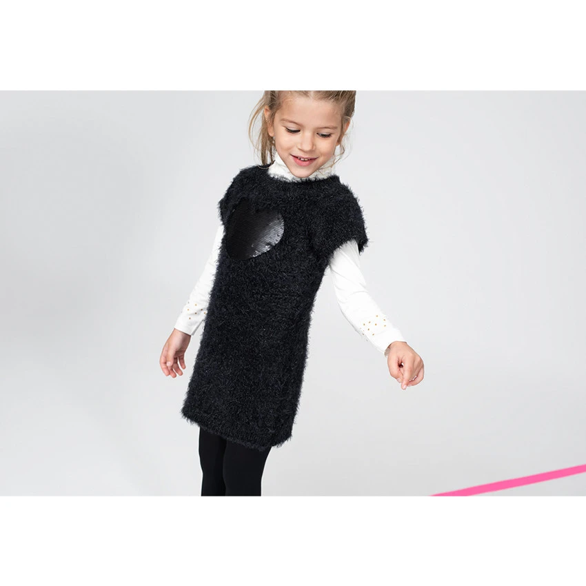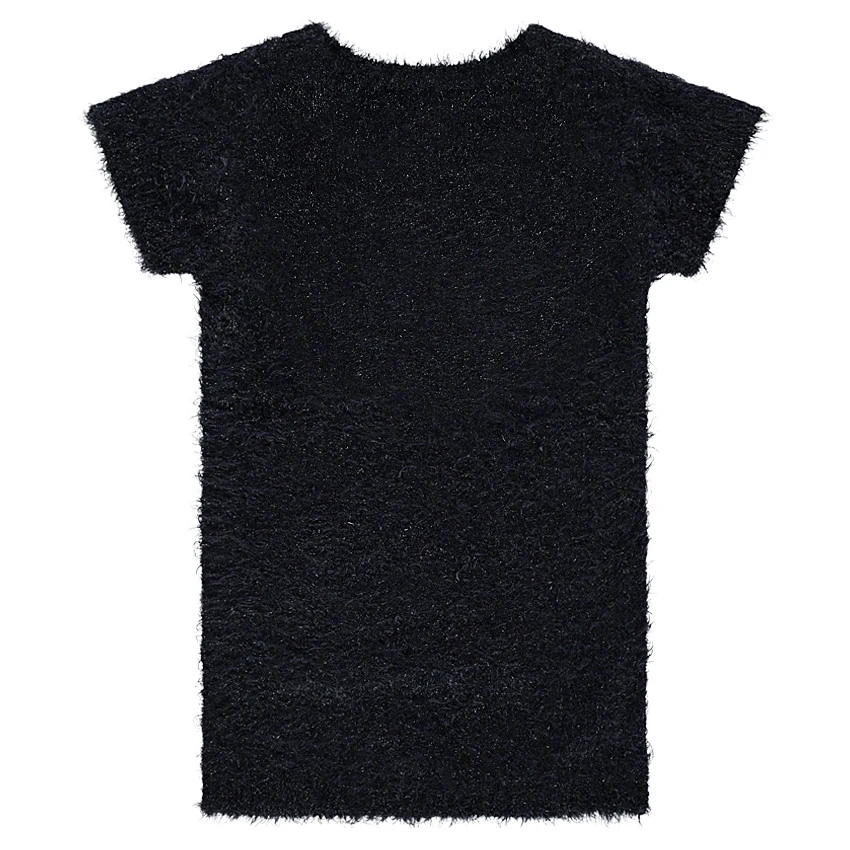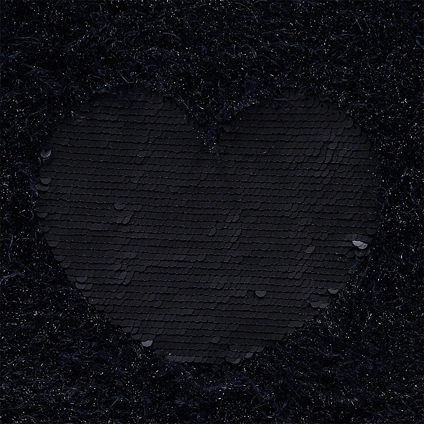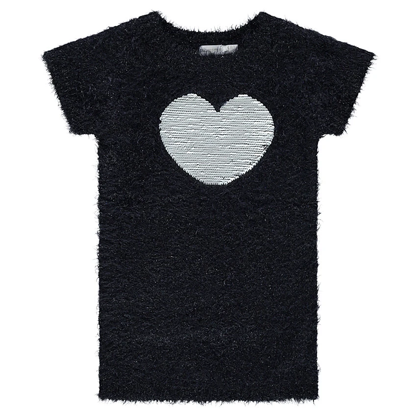 Robe manches courtes en tricot poil. Encolure ronde. Coeur en sequins magiques sur le devant. Dos uni. Longueur mi-cuisse.