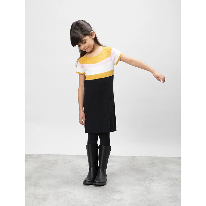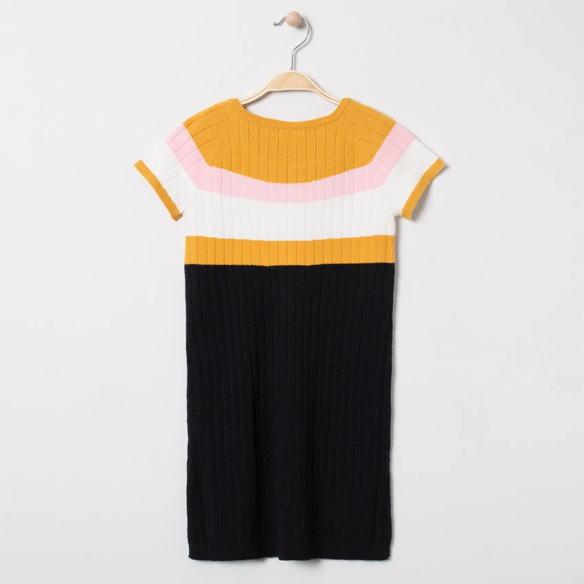 Robe manches courtes en tricot côtelé. Col rond en maille extensible. Bandes en jacquard sur le haut de la robe.