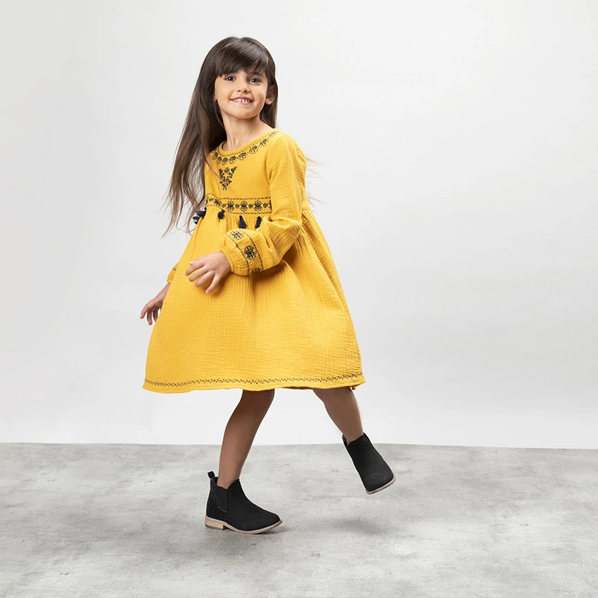 Robe manches longues en maille fantaisie. Col rond. Broderies style ethnique. Petits pompons sur le devant. Manches bouffantes resserrées sur les poignets. Coupe ample. Doublure intégrée.