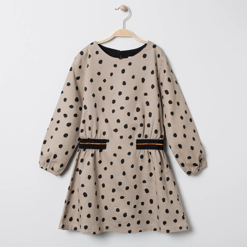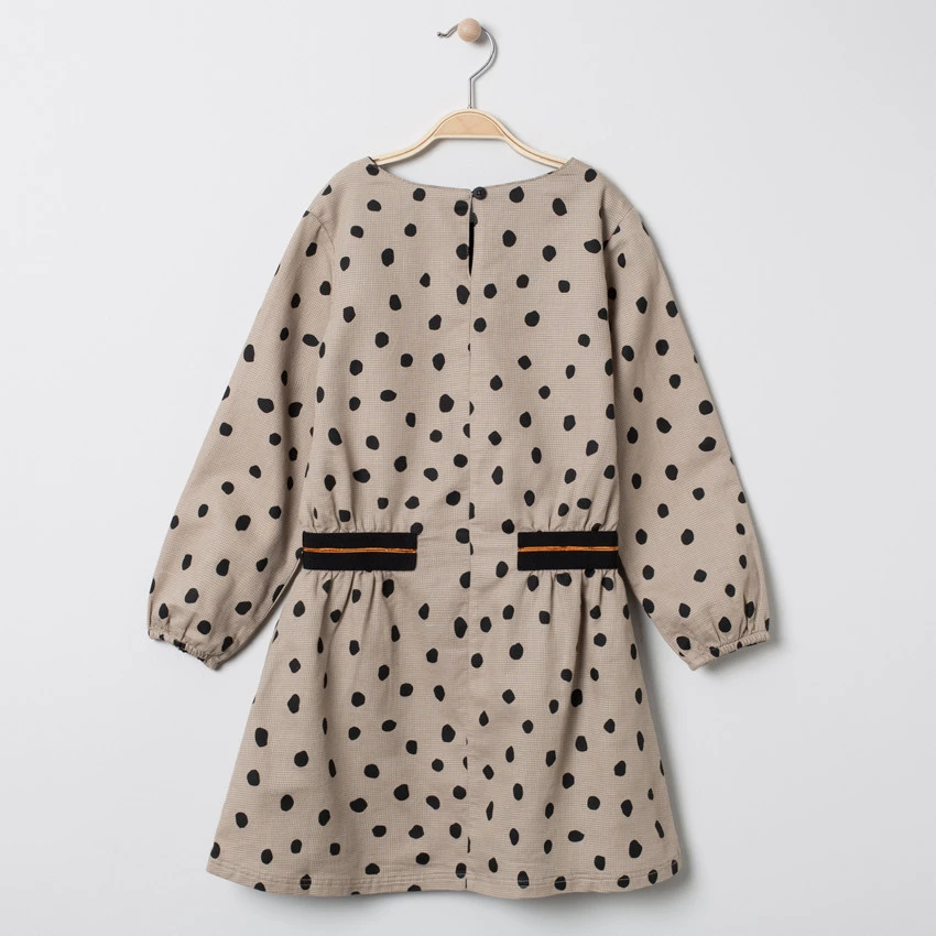 Robe manches longues en maille fantaisie. Imprimé pois all-over. Encolure ronde. Taille élastiquée. Bout des manches élastiqué. Ouverture boutonnée au dos.