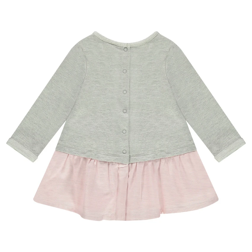 Robe manches longues effet 2 en 1. Encolure ronde. Haut de la robe en molleton. Revers fixe au bout des manches. Bas de la robe tissé effet slub. Ouverture pressionnée au dos.
