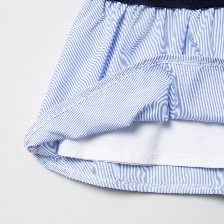 Robe en maille manches longues effet 2 en 1. Encolure ronde en bord-côte. Badges patchés sur le devant avec sequins. Bas de la robe effet chemise à fines rayures verticales. Doublure sur le bas.