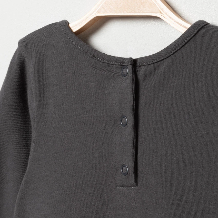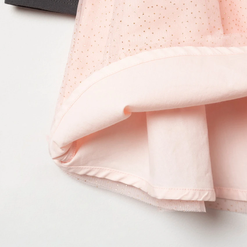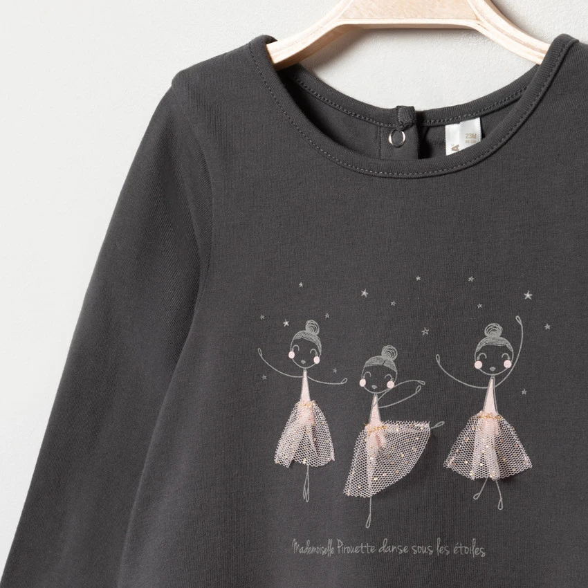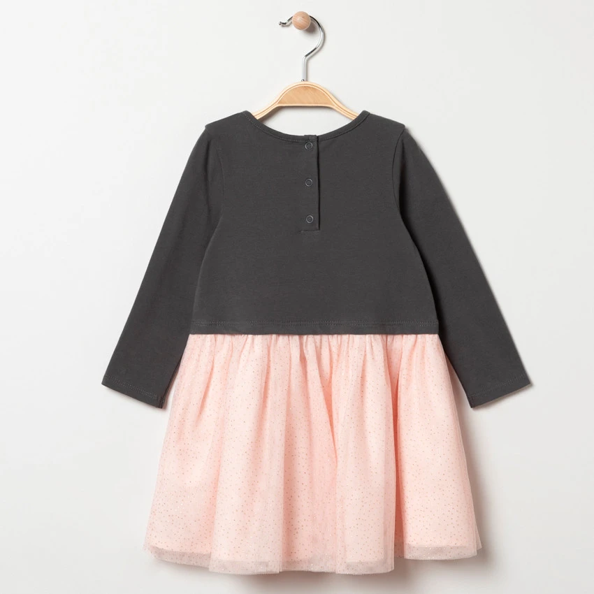 Robe manches longues effet 2 en 1. Col rond en maille extensible. Danseuses printées devant avec empiècements en tulle. Bas de la robe en tulle avec petits points dorés. Doublure en coton pour plus de confort et une bonne opacité. Ouverture pressionnée au dos pour l’enfiler facilement.