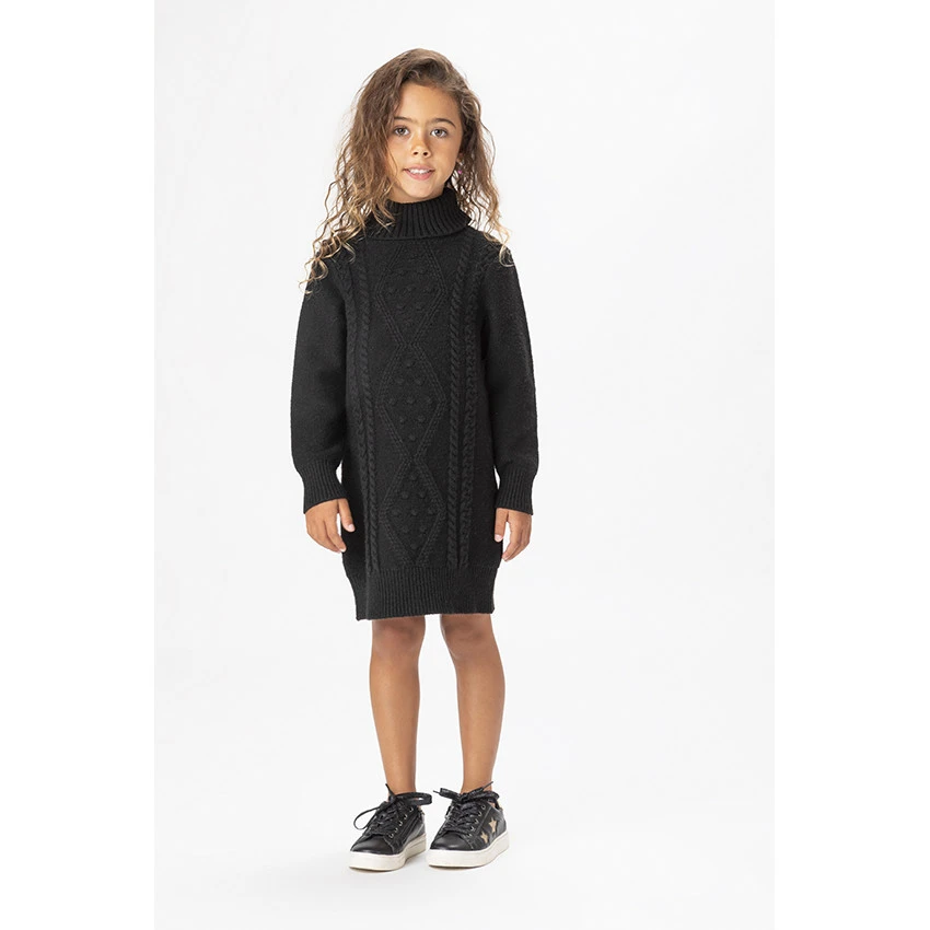 Robe manches longues en maille mélangée de fils brillants. Col rond en maille extensible. Jeux de mailles. Pompons sur le devant. Poignets et base en maille extensible.