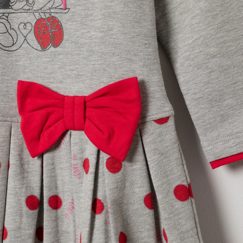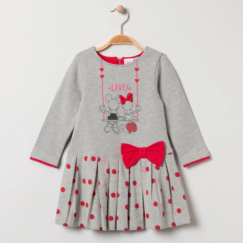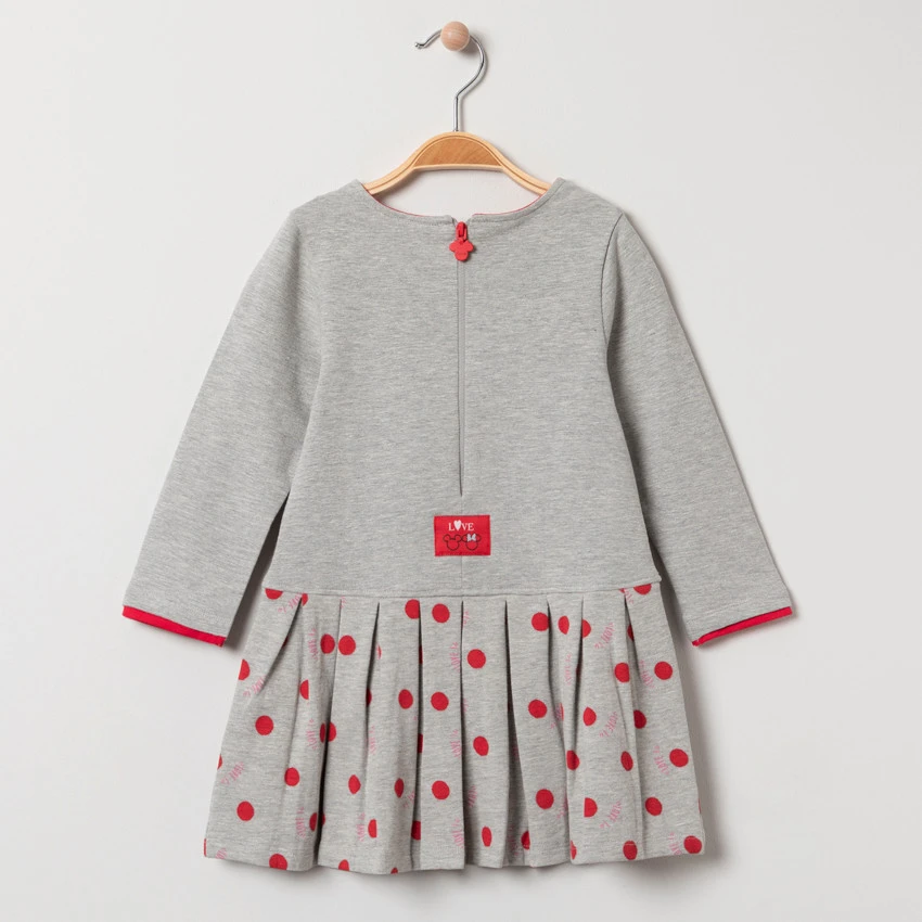 Robe manches longues en maille. Encolure ronde. Print Mickey et Minnie avec détails en encre gonflante, paillettes et relief. Noeud en relief à la taille. Bas de la robe à pois contrastés. Effet de superposition au bout des manches. Ouverture zippée au dos avec pendantif forme Minnie. Etiquette tissée au dos.