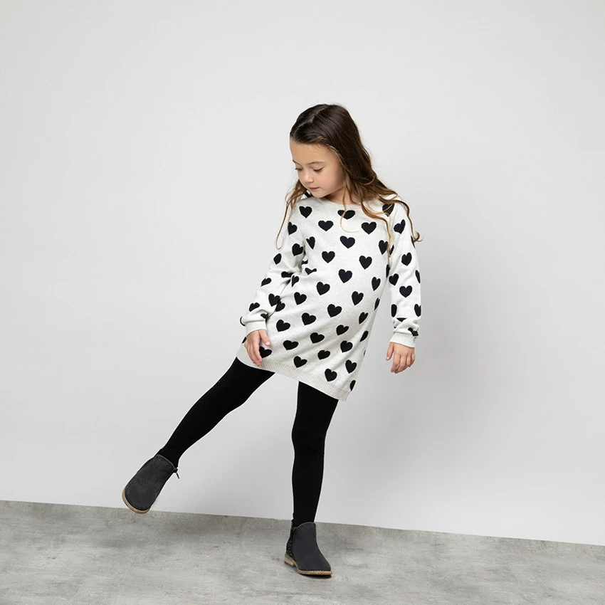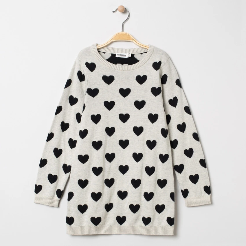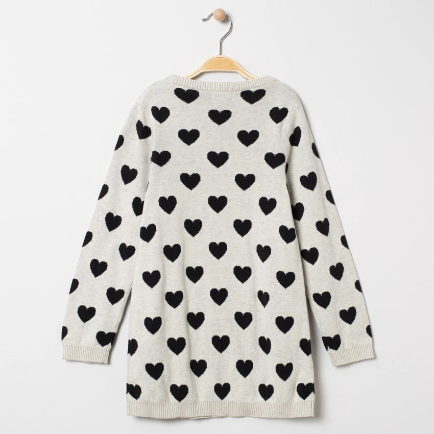 Robe manches longues en tricot. Col en maille extensible pour l’enfiler facilement. Coeurs en jacquard all-over pour la touche d’originalité. Poignets et base en bord-côte.