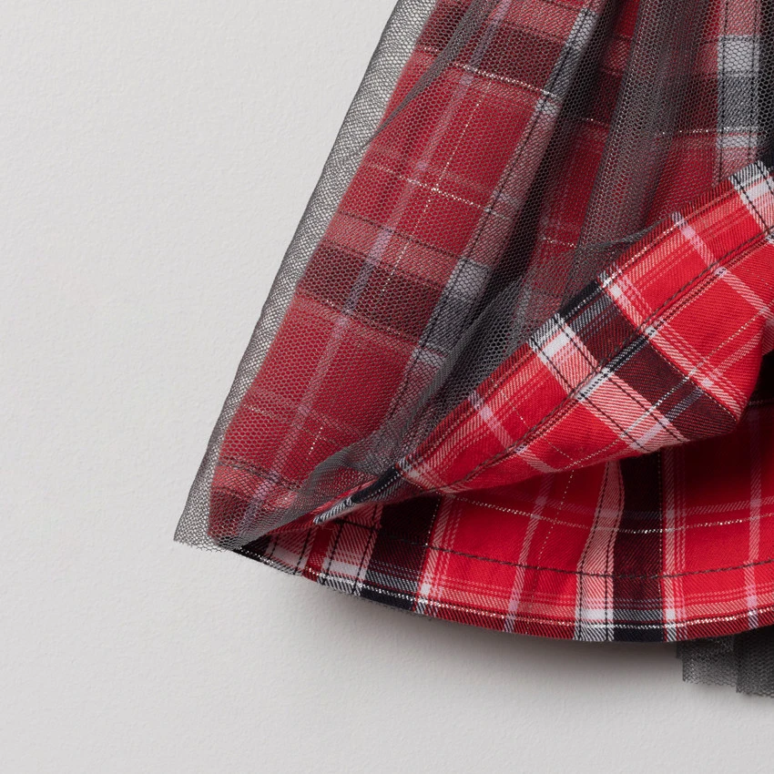 Robe en jean forme salopette. Bretelles pressionnées. Découpe à la taille à passants. 1 poche à carreaux et broderies Minnie. Doublure à carreaux. Bas de la robe en tulle avec doublure à carreaux.