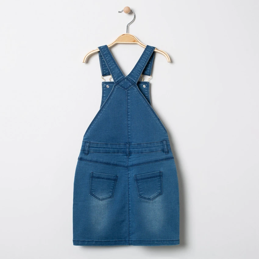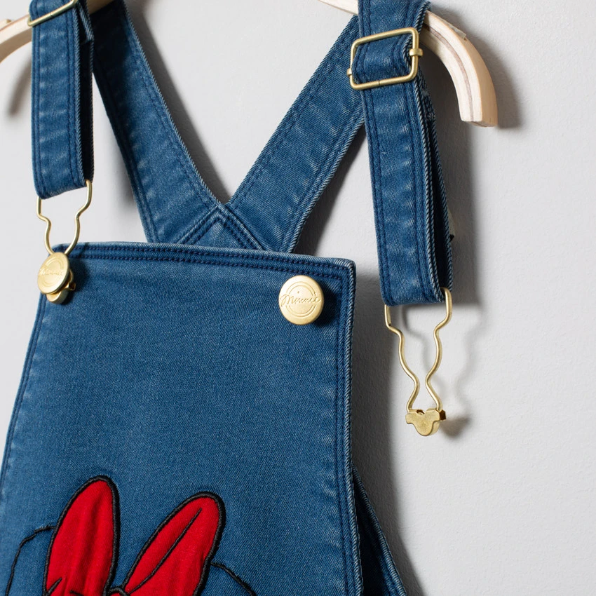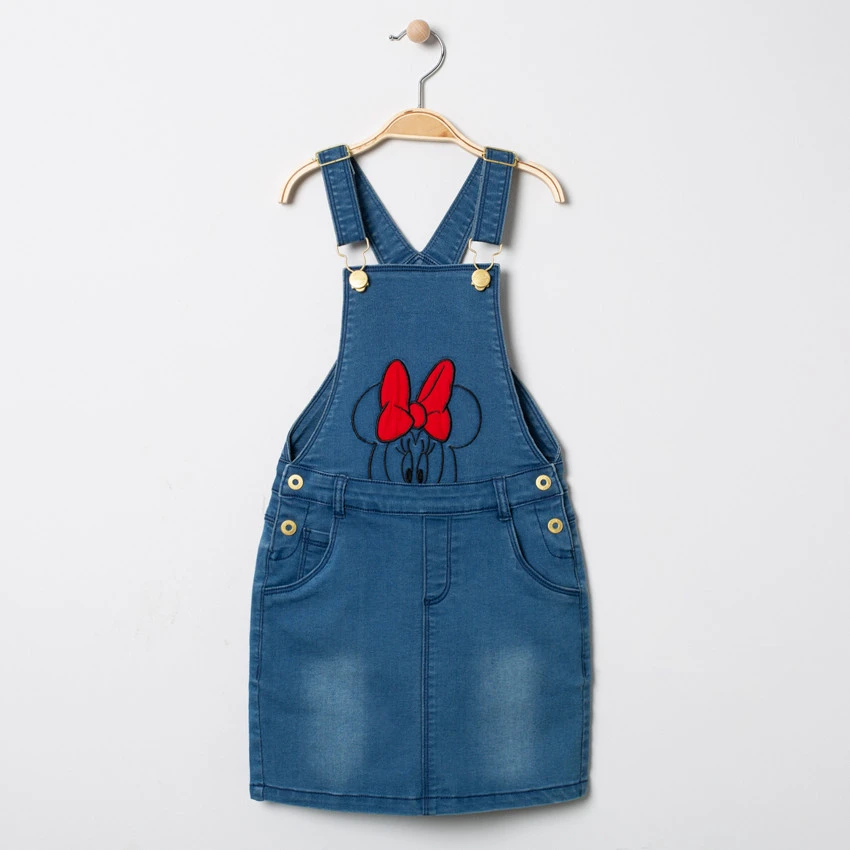Robe salopette en jean effet used. Bretelles ajustables. Minnie brodée sur le devant. Découpe à la taille avec ouvertures pressionnées sur les côtés. 2 poches cavalières devant. 2 poches plaquées au dos.
