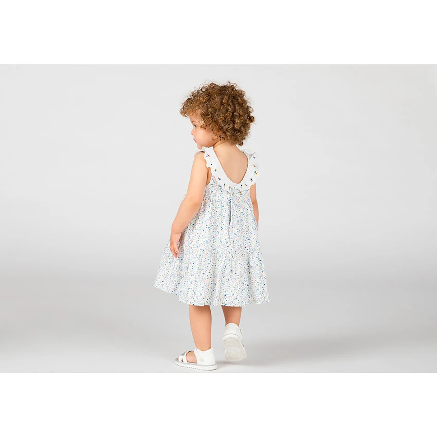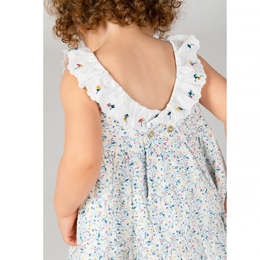 Robe sans manches. Col volanté contrasté avec broderies devant et derrière. Robe à volants. Imprimé fleuri all-over. Dos en V avec ouverture boutonnée.
