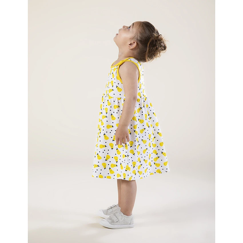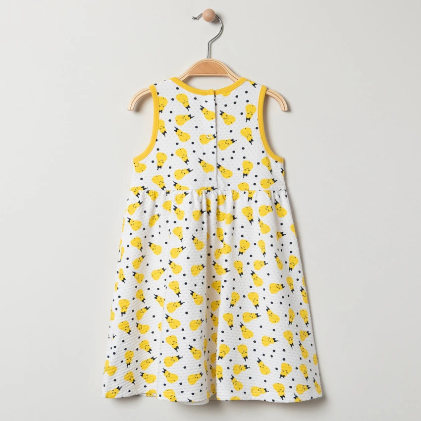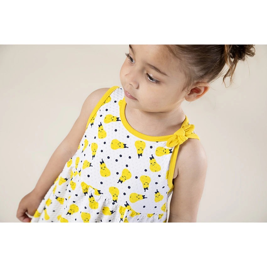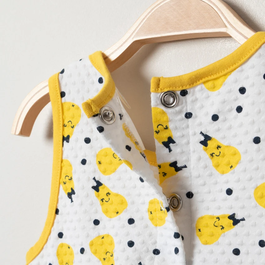 Robe sans manches en maille fantaisie. Encolure ronde avec noeud sur le côté. Poires imprimées all-over. Ouverture pressionnée au dos.