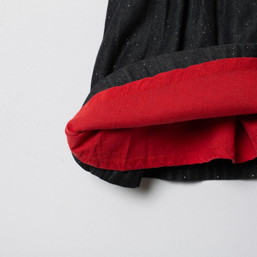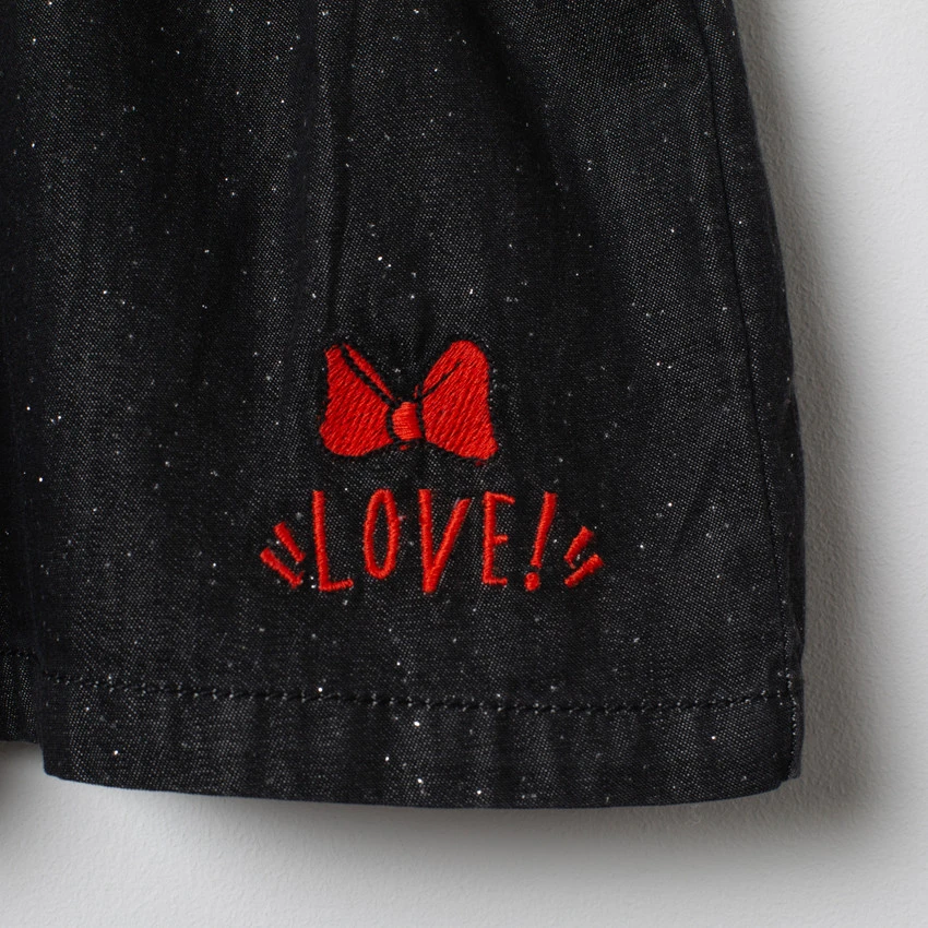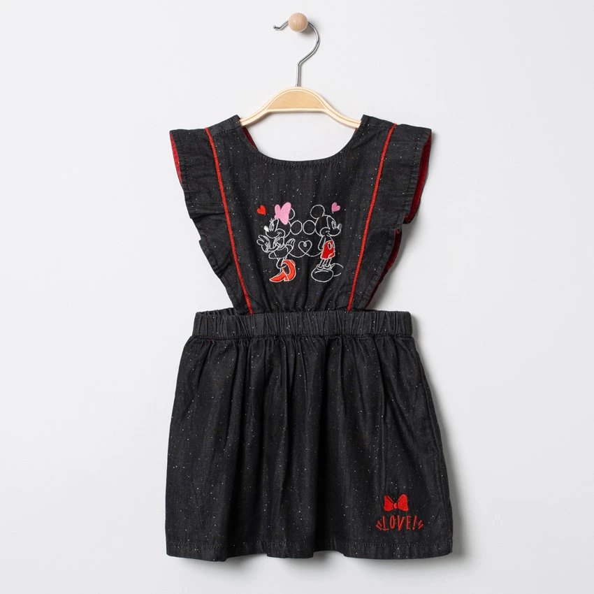 Robe tablier à manches volantées.Chambray effet neps. Doublure contrastée. Encolure ronde. Mickey & Minnie brodés devant. Surpiqûres contrastées. Taille élastiquée. Dos boutonné.