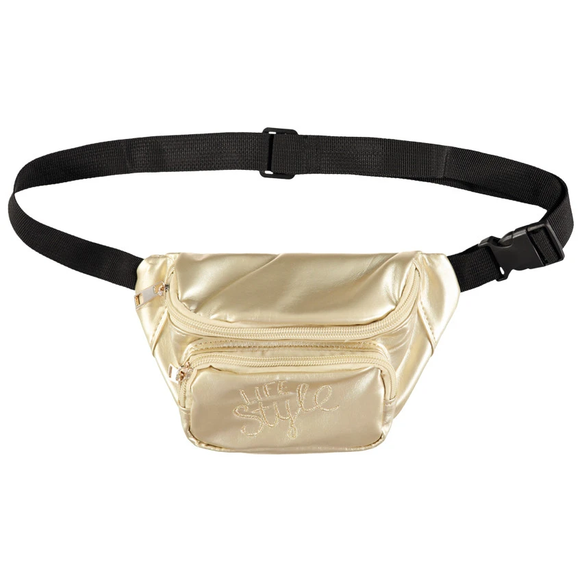 Sac banane doré. Large compartiment zippé et une poche zippée sur le devant. Inscription brodée devant. Ceinture ajustable avec clip.