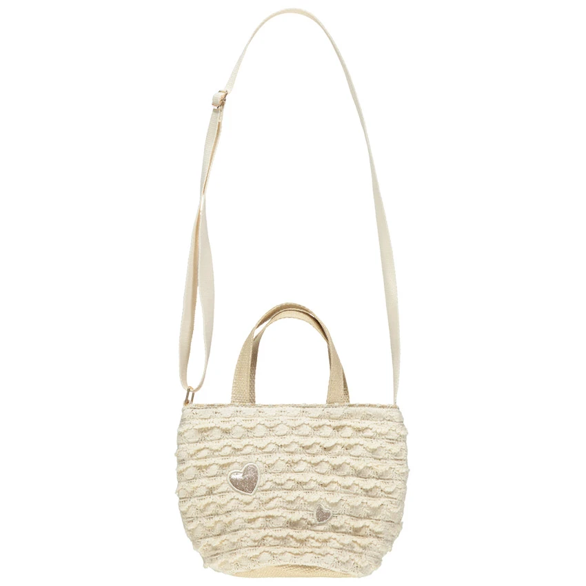 Sac bandoulière en dentelle. 2 anses de portage sur le dessus. Ouverture sur le dessus avec large compartiment. Coeurs pailletés. Bandoulière réglable.