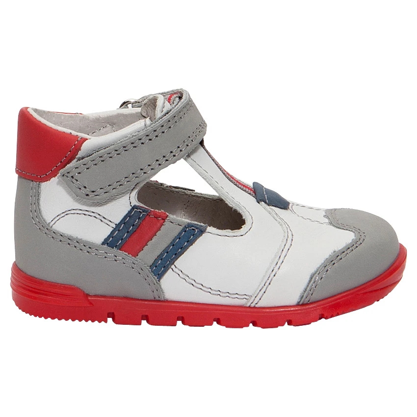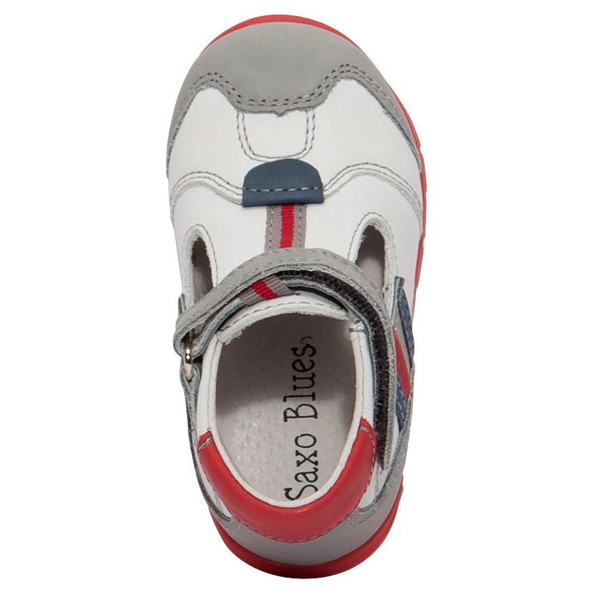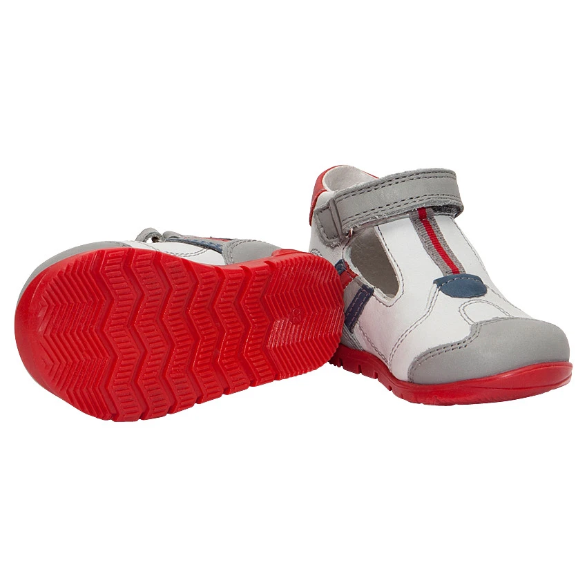 Salomés en cuir. Ouverture pratique par bride à scratch. Empiècements contrastés sur les côtés. Renfort semi rigide pour un bon maintien du talon.