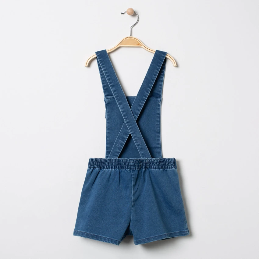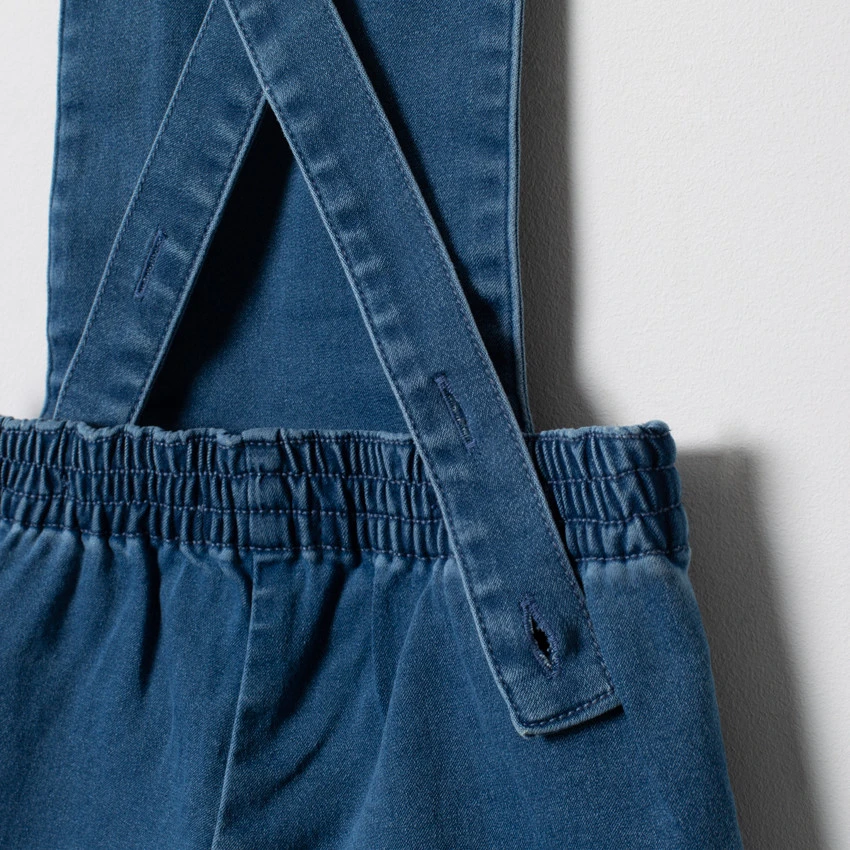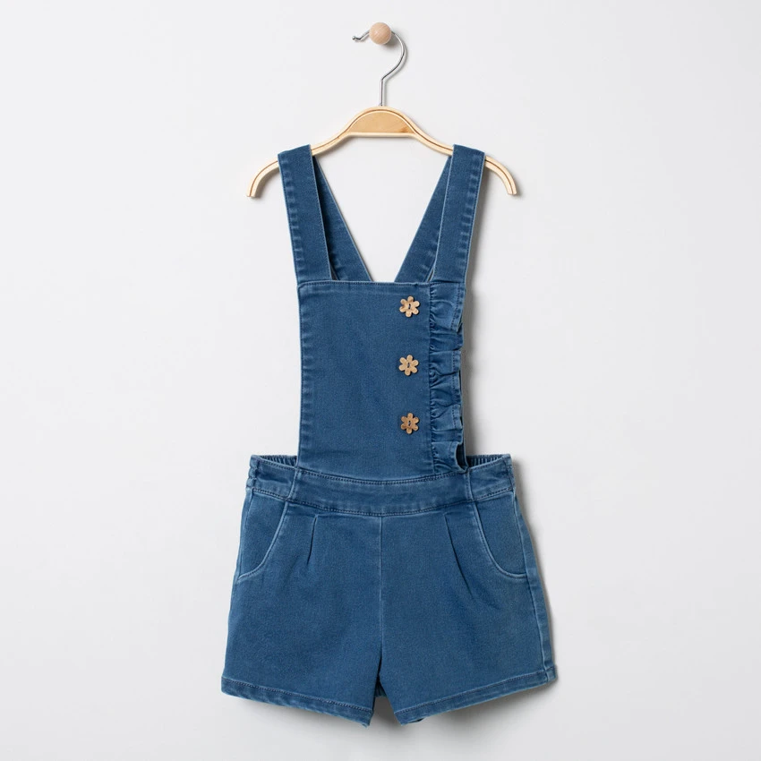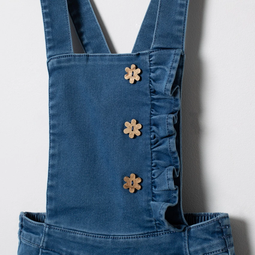 Salopette courte en jean effet used. Volant vertical. Boutons forme fleur. Taille élastiquée. 2 poches cavalières devant. Bretelles croisées au dos.