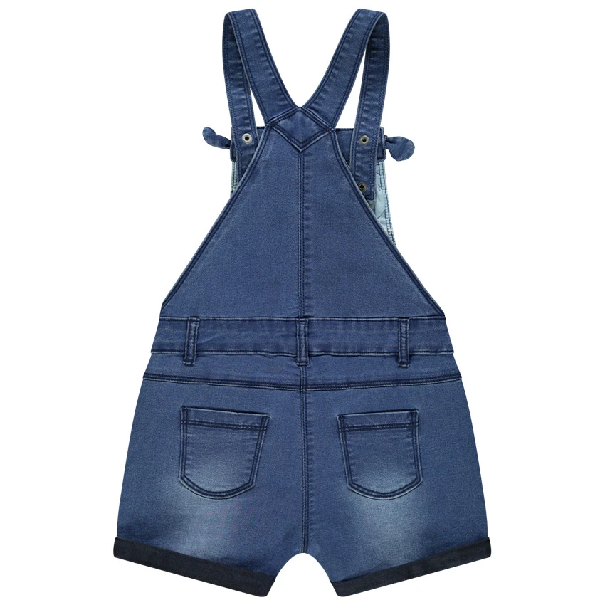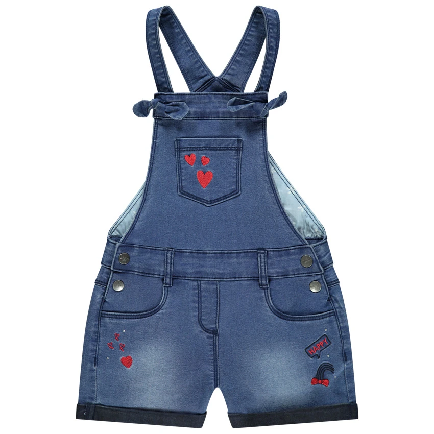 Salopette courte en jean effet used. Bretelles ajustables. 1 poche plaquée sur la poitrine avec coeurs brodés. Taille à passants à ouverture pressionnée sur les côtés. 2 poches cavalières devant. Broderies sur les jambes. 2 poches plaquées au dos.