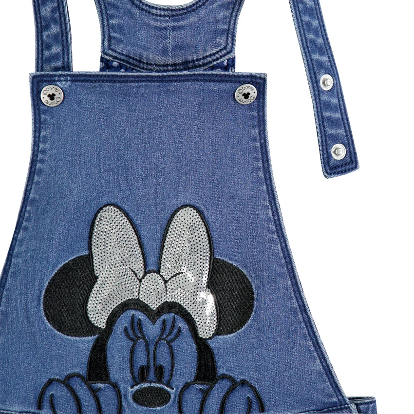 Salopette courte en jean effet used. Bretelles ajustables. Minnie brodée devant. Taille à passants. Ouverture boutonnée sur les côtés. 2 poches cavalières devant. Doublure à pois.