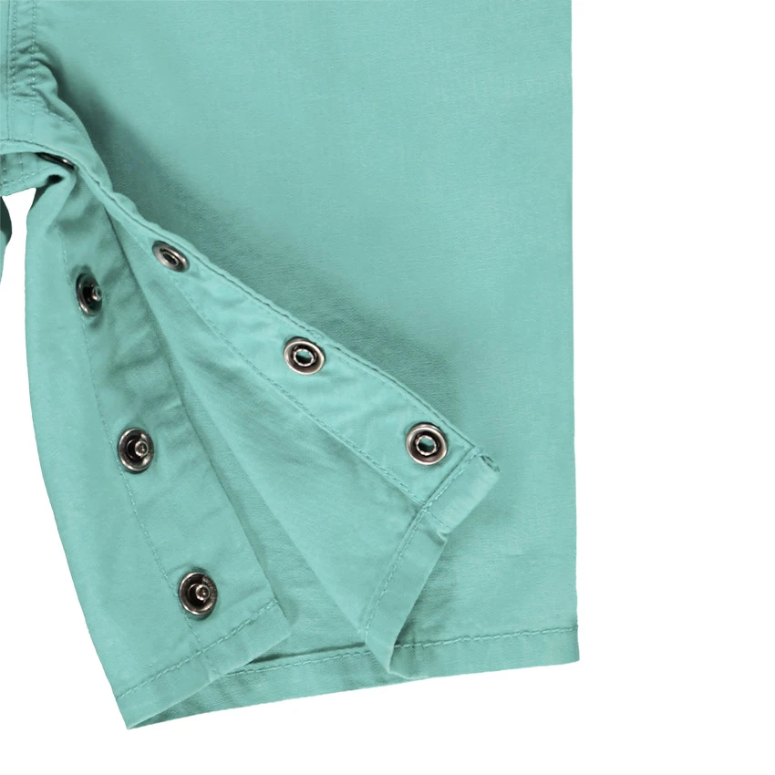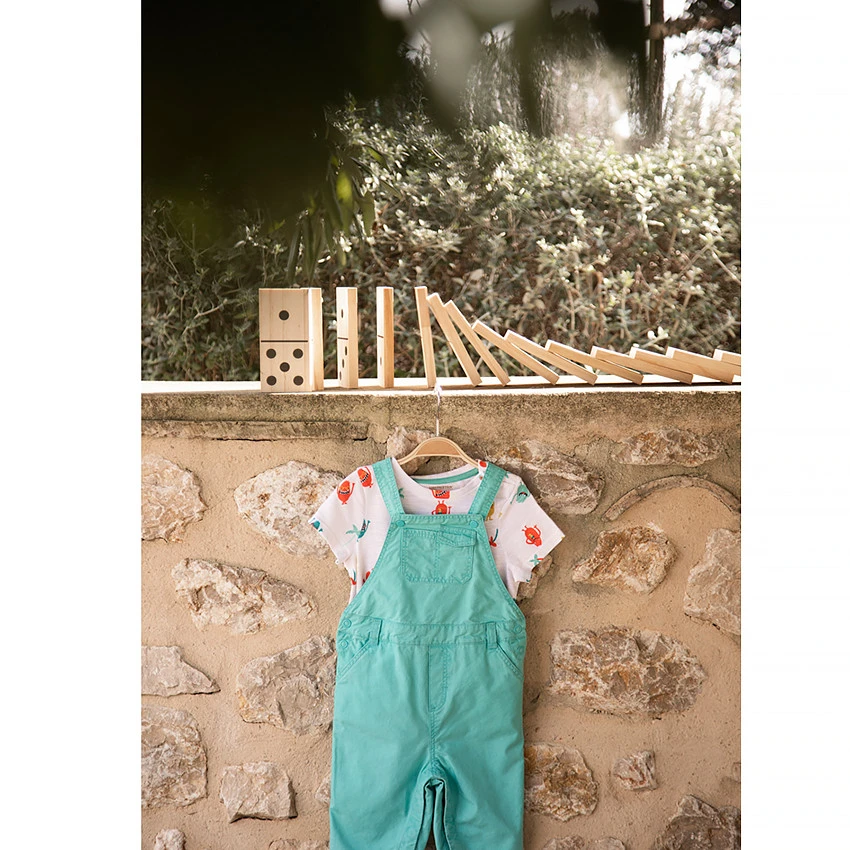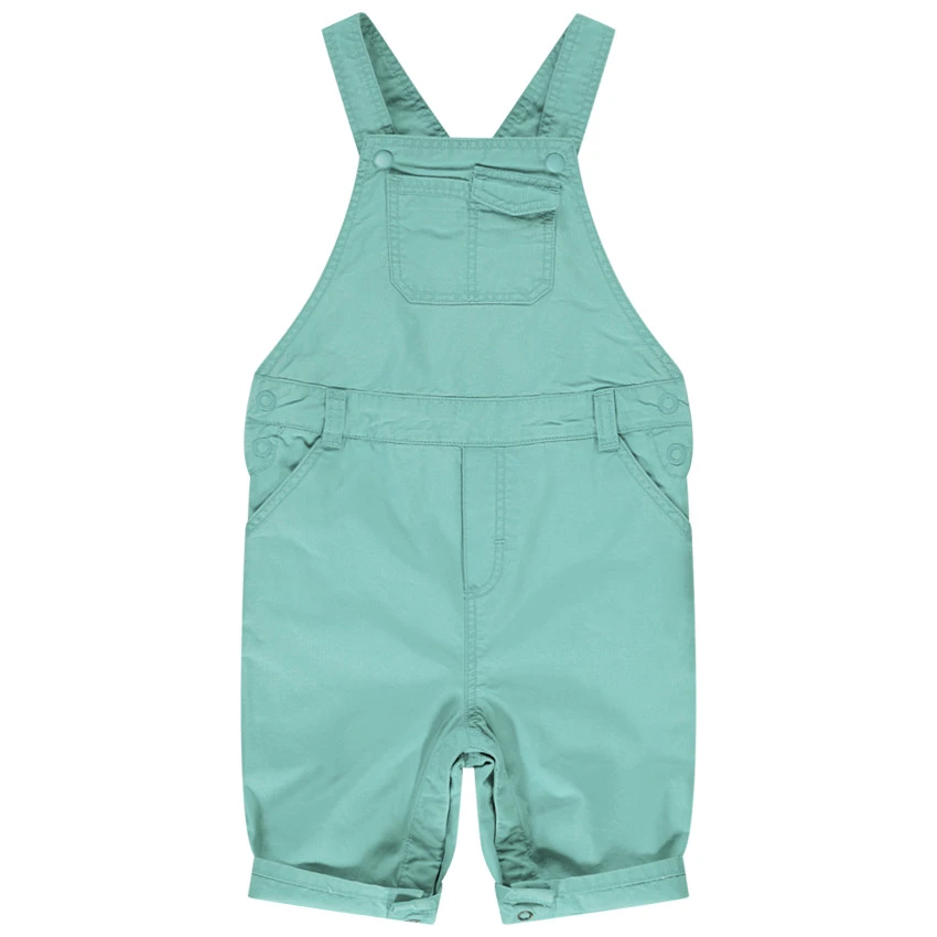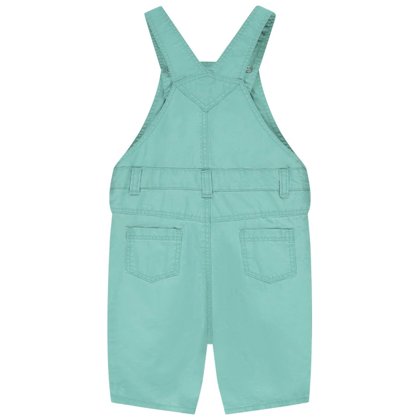 Salopette courte. Bretelle ajustable. 2 poches plaquées sur le devant. Taille avec passant pour ceinture et boutons pour l’enfiler plus facilement. Revers au bas boutonné.