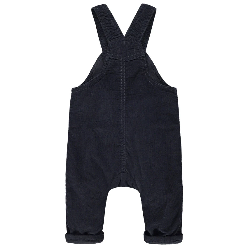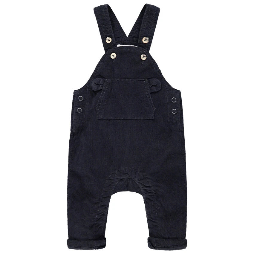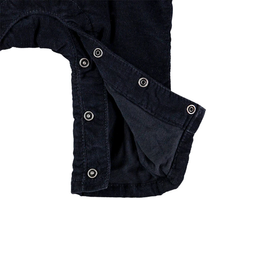 Salopette en velours. Bretelles pressionnées ajustables. 1 poche kangourou sur le devant avec oreilles en relief. Ouvertures pressionnées sur les côtés. Entrejambe pressionné. Doublure en jersey.
