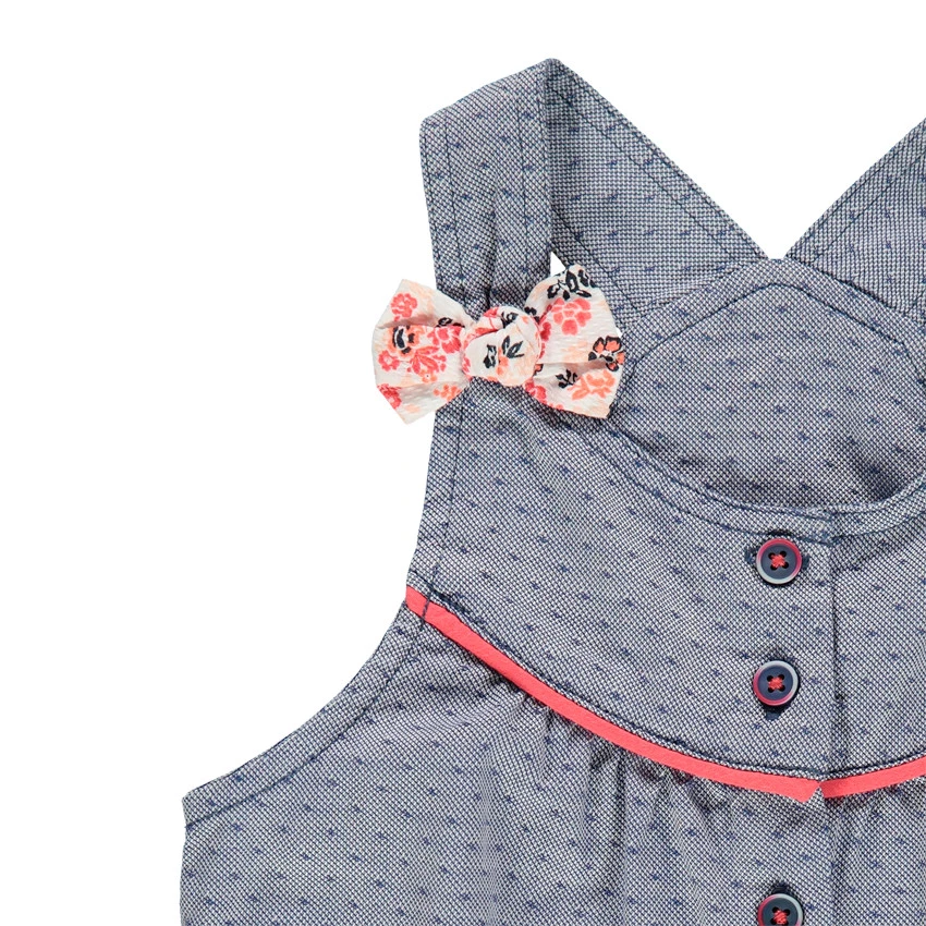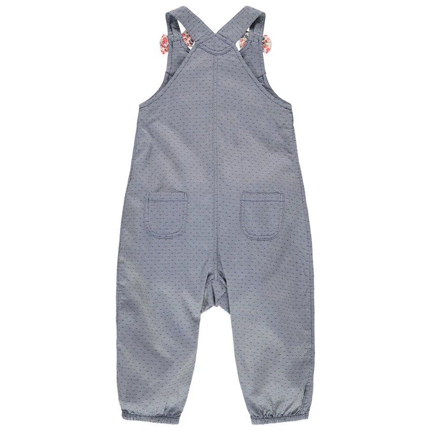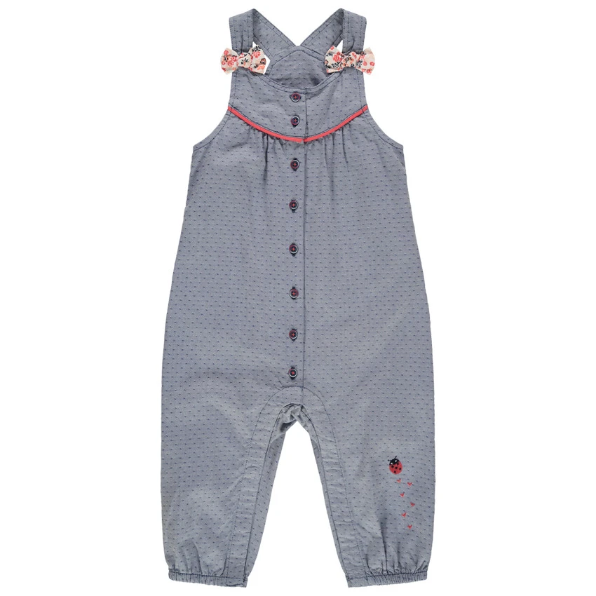 Salopette longue en jacquard. Encolure ronde. Ouverture boutonnée sur le devant. Noeuds imprimés sur les bretelles. Coccinelle brodée sur la jambe. Entrejambe pressionné.