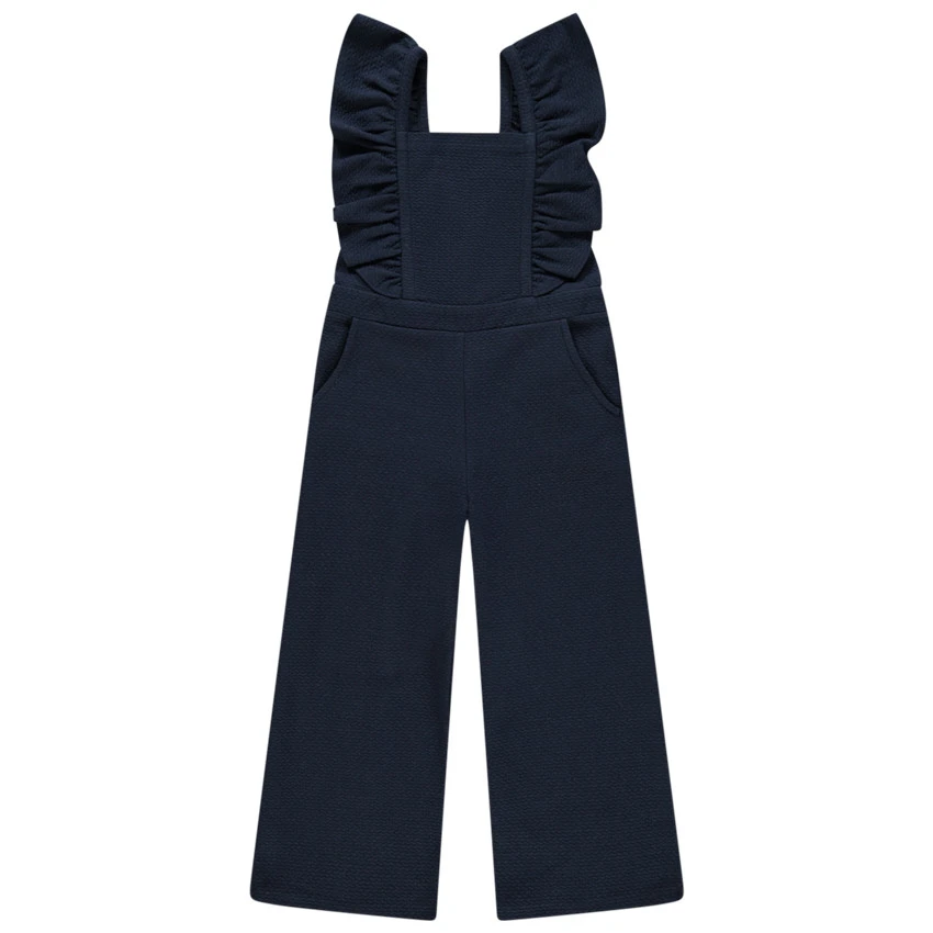 Salopette longue en jacquard bleu marine. Bretelles volantées croisées au dos. 2 poches cavalières devant. Coupe ample.