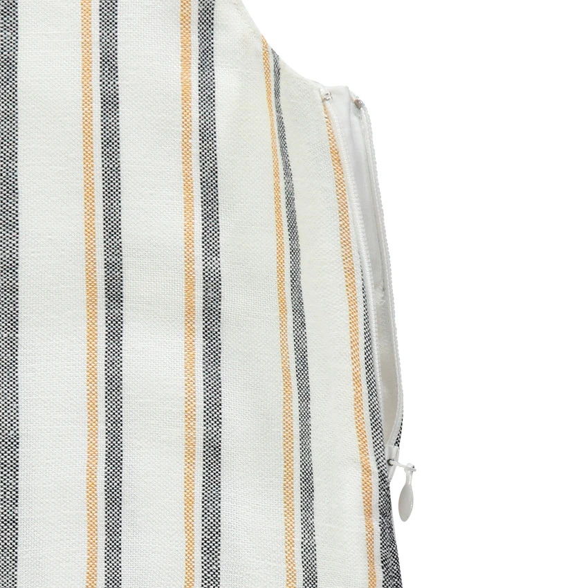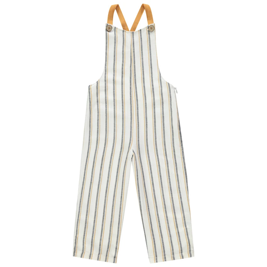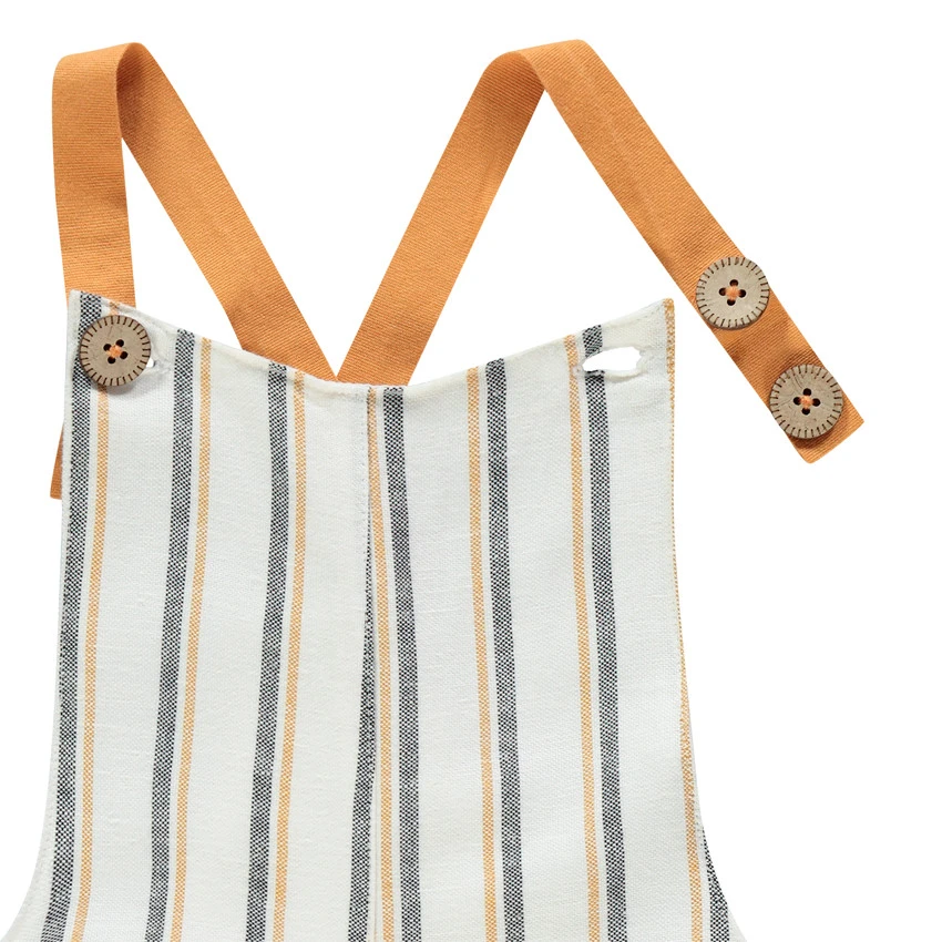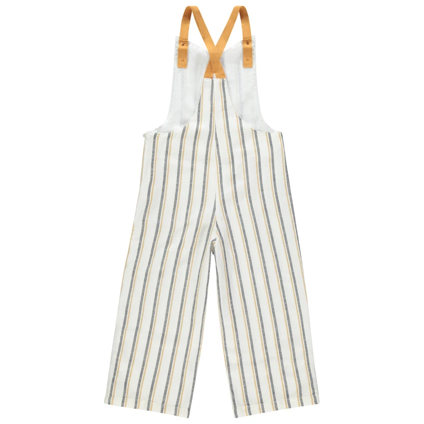 Salopette longue en toile à base de coton et lin. Rayures verticales all-over. Bretelles ajustables. Ouverture zippée sur le côté.