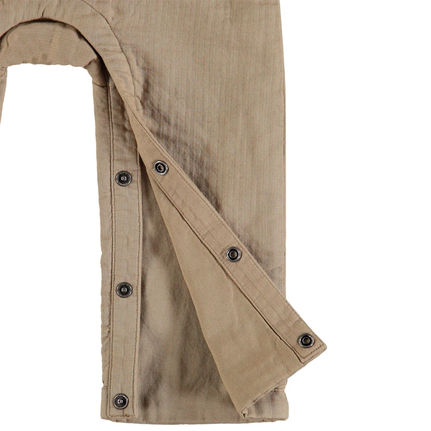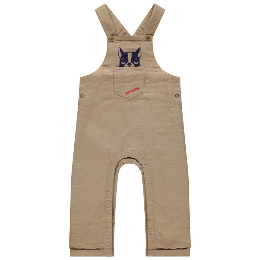 Salopette en toile unie. Bretelles austables. Bouledogue printé au dessus de la poche devant. Entrejambe pressionné. Ouvertures pressionnées sur les côtés. Entrejambe pressionné.