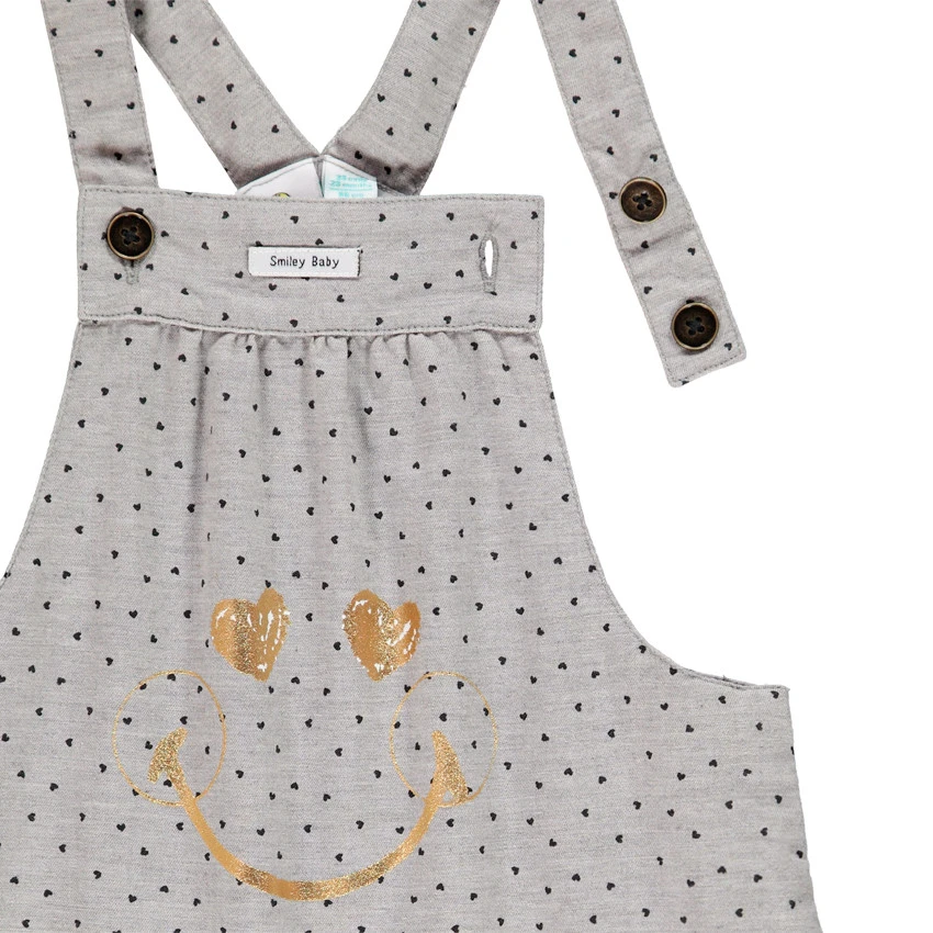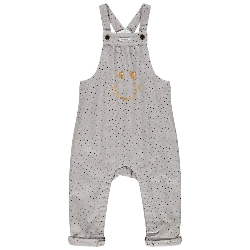 Salopette longue pour bébé fille. Imprimé pois. Bretelles ajustables par boutons. Smiley Baby printé en foil doré sur le devant. Entrejambe pressionné pour le côté pratique.