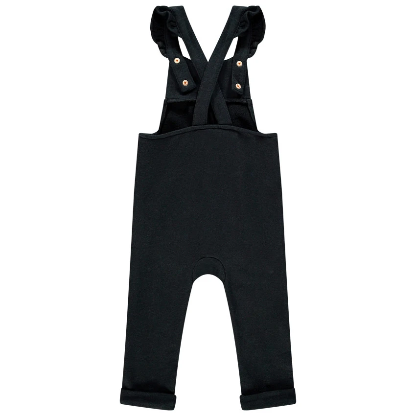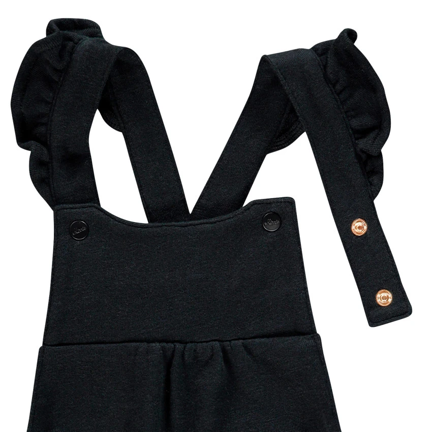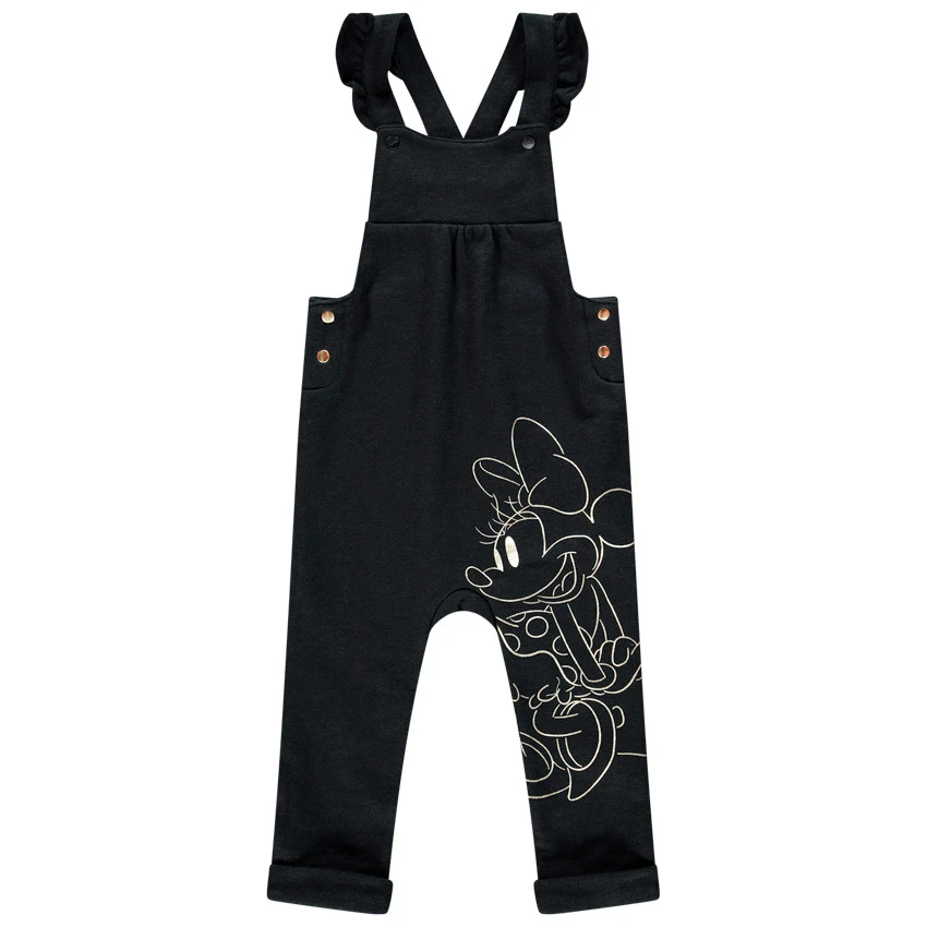 Salopette longue unie. Bretelles volantées ajustables. Ouverture pressionnée sur les côtés. Minnie printée sur la jambe gauche. Bretelles croisées au dos.