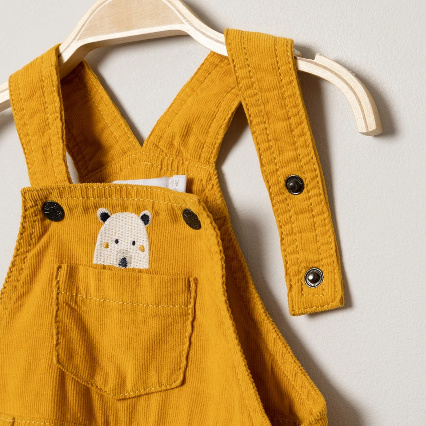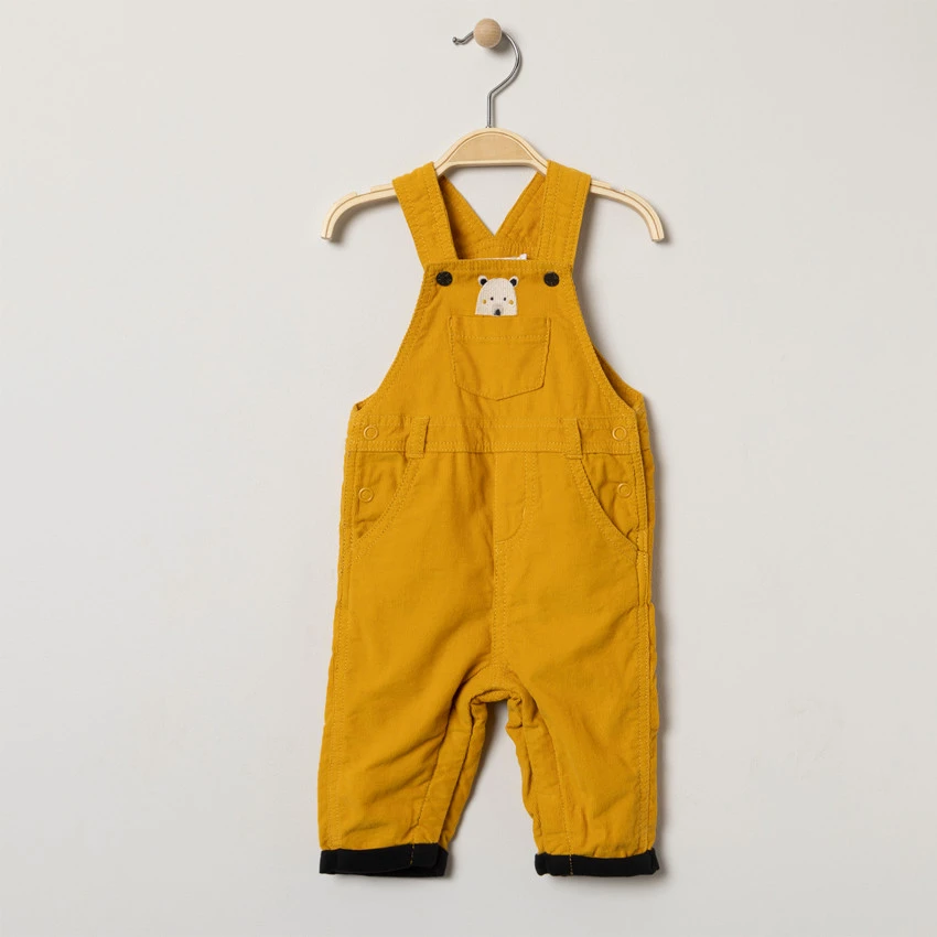 Salopette en velours milleraies. Bretelles ajustables. 1 poche plaquée sur la poitrine avec ours brodé. Taille élastiquée à passants. Ouvertures pressionnées sur les côtés. Doublure en jersey. 2 poches cavalières devant. Entrejambe pressionné. 2 poches plaquées au dos.