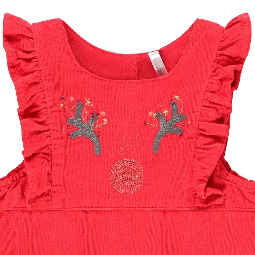 Salopette longue en velours milleraies. Bretelles volantées. Bois de renne brodés devant. Dos boutonné, entrejambe pressionné pour faciliter le change et l’habillement.